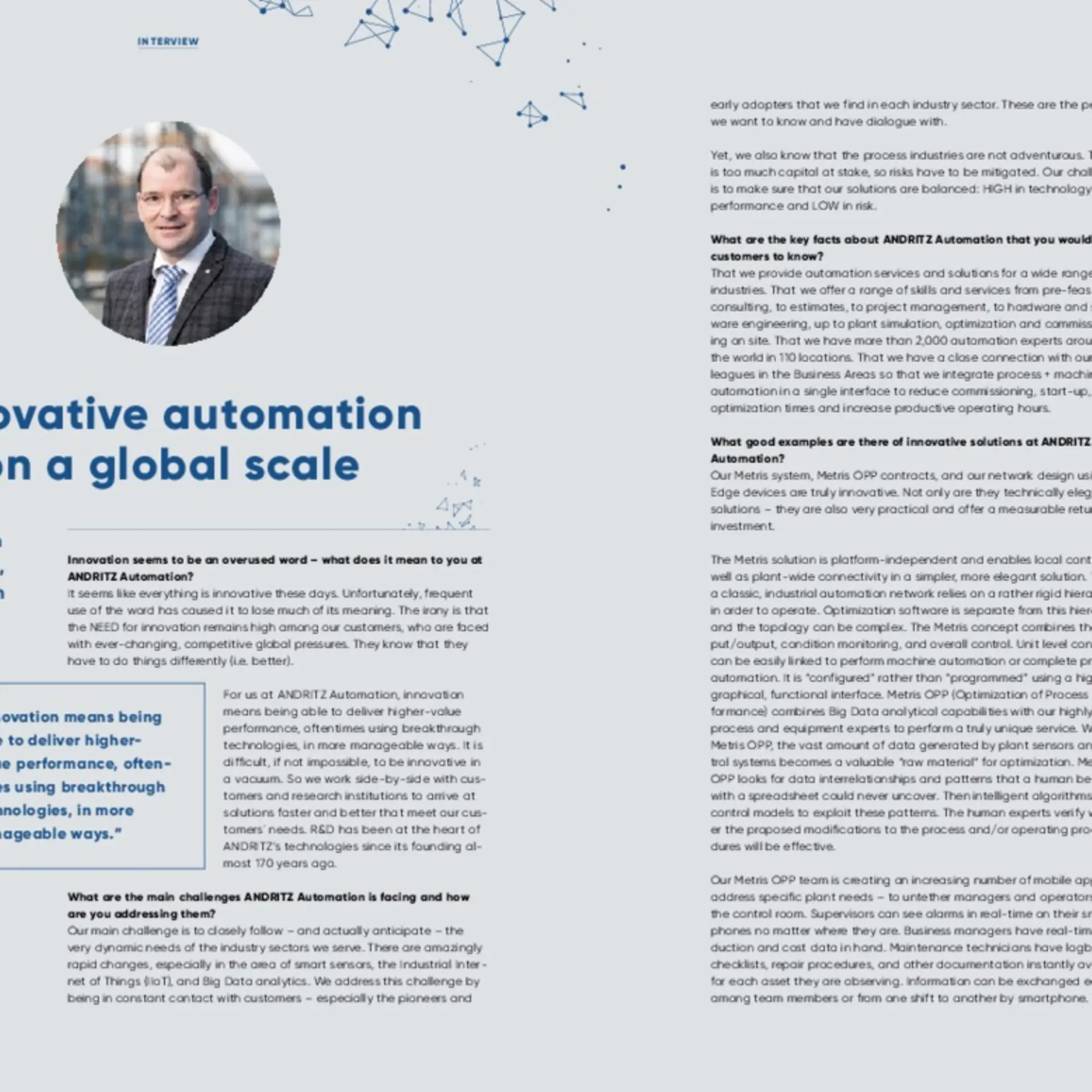 For us at ANDRITZ Automation, innovation means being able to deliver higher-value performance, oftentimes using breakthrough technologies, in more manageable ways. It is difficult, if not impossible, to be innovative in a vacuum. So we work side-by-side with customers and research institutions to arrive at solutions faster and better that meet our customers ´ needs. R&D has been at the heart of ANDRITZ’s technologies since its founding almost 170 years ago.