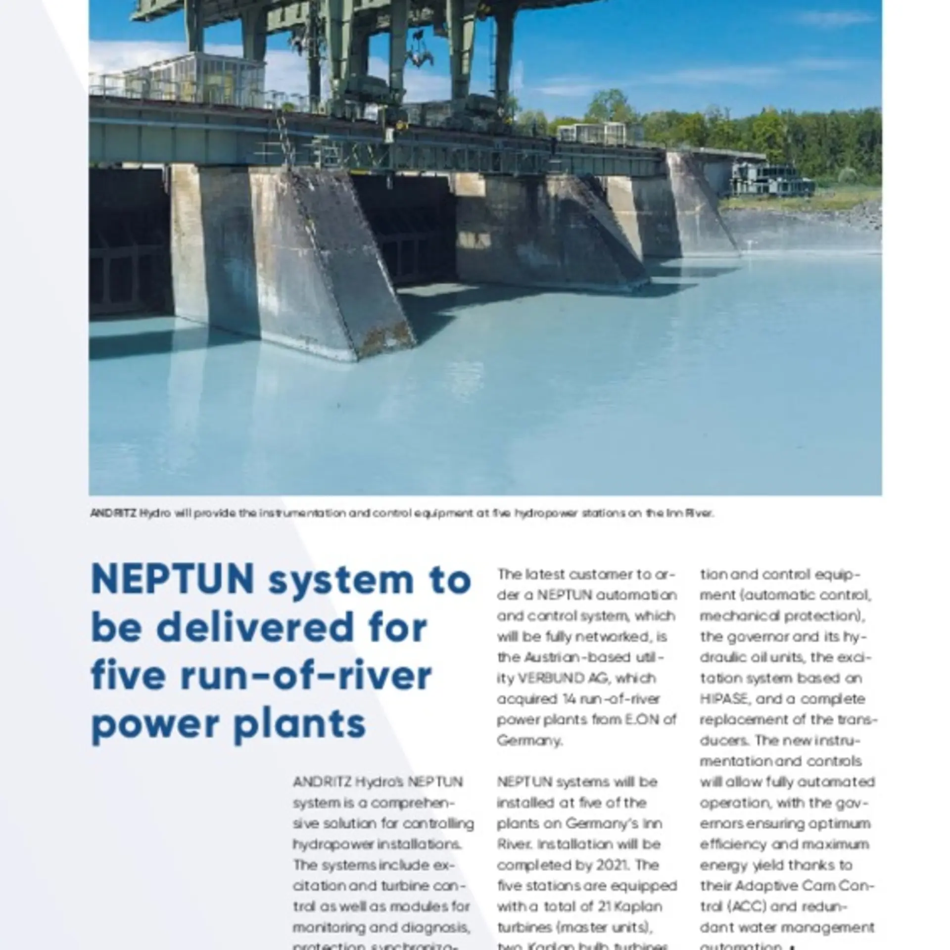 ANDRITZ Hydro’s NEPTUN system is a comprehensive solution for controlling hydropower installations. The systems include excitation and turbine control as well as modules for monitoring and diagnosis, protection, synchronization, and overall power plant management. The latest customer to order a NEPTUN automation and control system, which will be fully networked, is the Austrian-based utility VERBUND AG, which acquired 14 run-of-river power plants from E.ON of Germany.