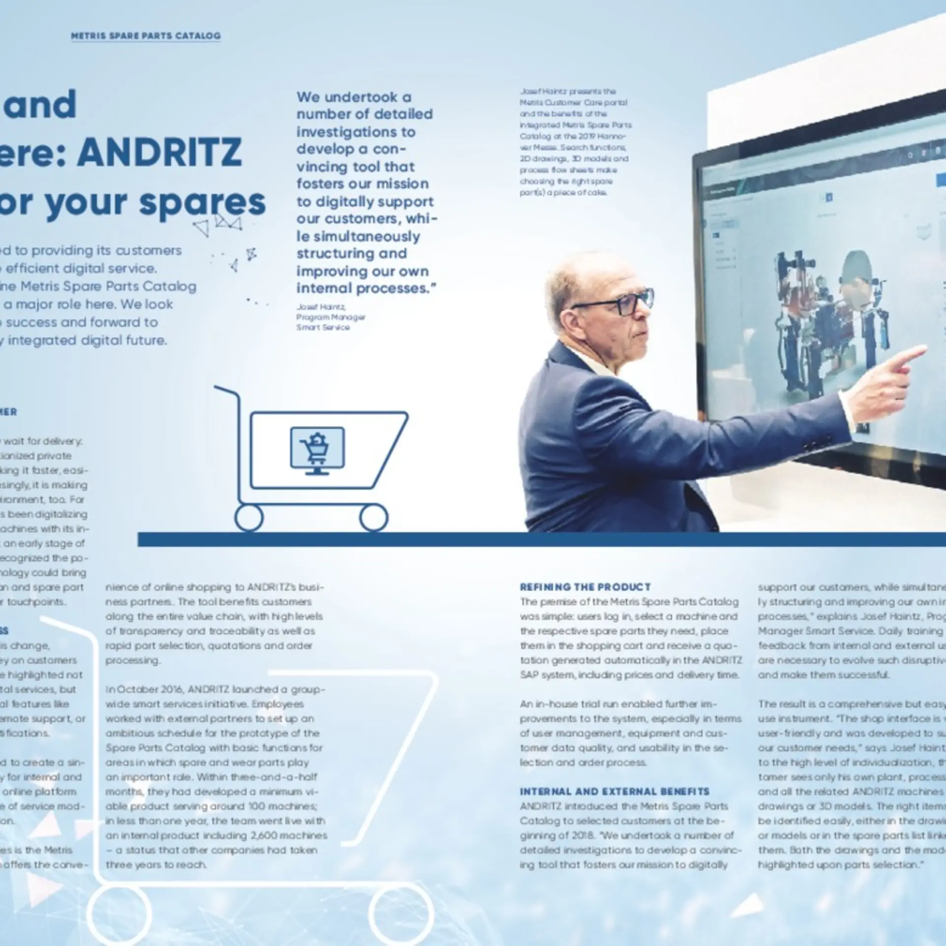 One of these service modules is the Metris Spare Parts Catalog, which offers the convenience of online shopping to ANDRITZ’s business partners. The tool benefits customers along the entire value chain, with high levels of transparency and traceability as well as rapid part selection, quotations and order processing.