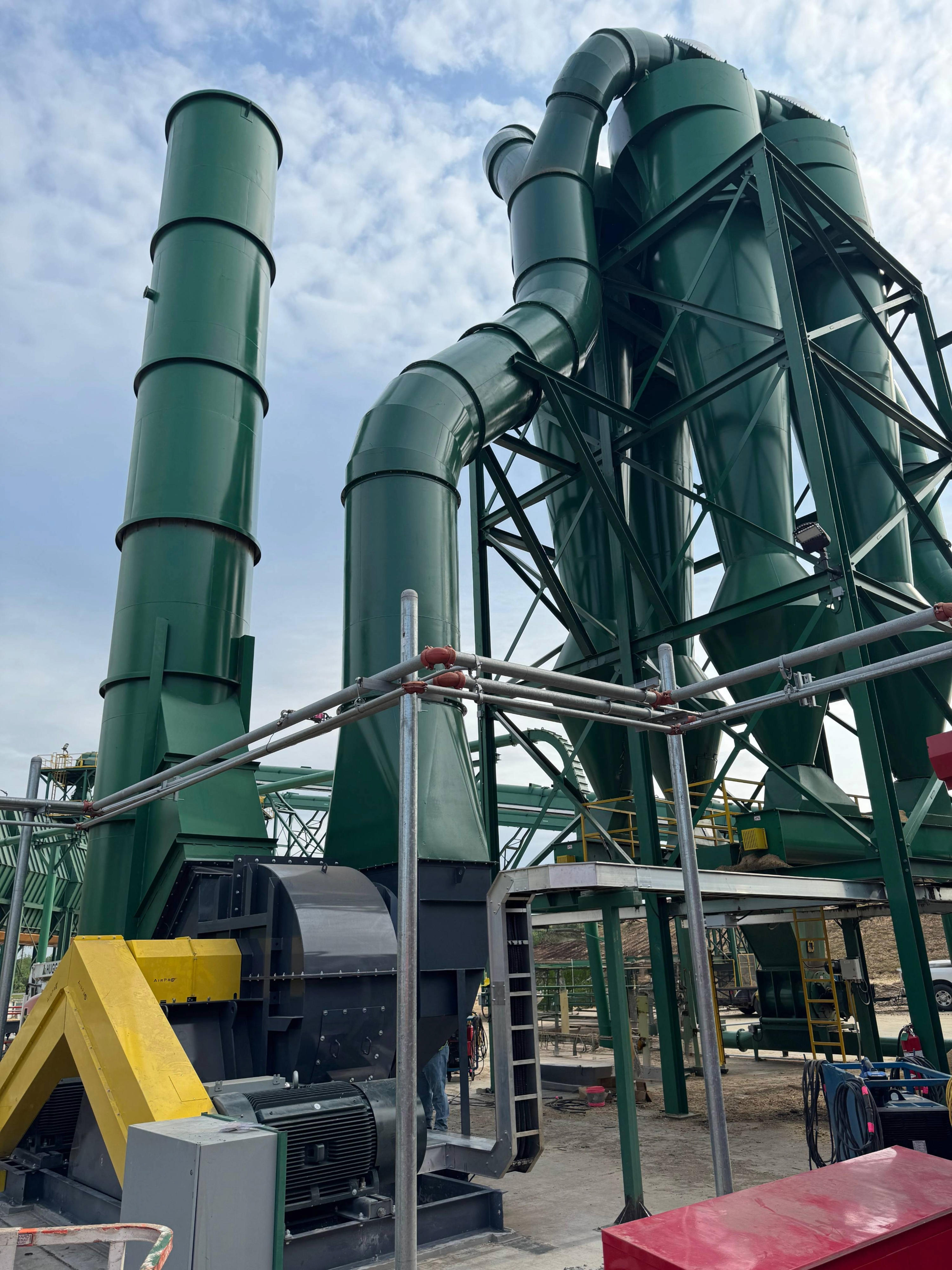 Example: A wood products facility conveying larger chips across the plant to multiple cyclones and storage bins - requiring precise control, higher pressure, and wear-resistant elbows to handle abrasive material.