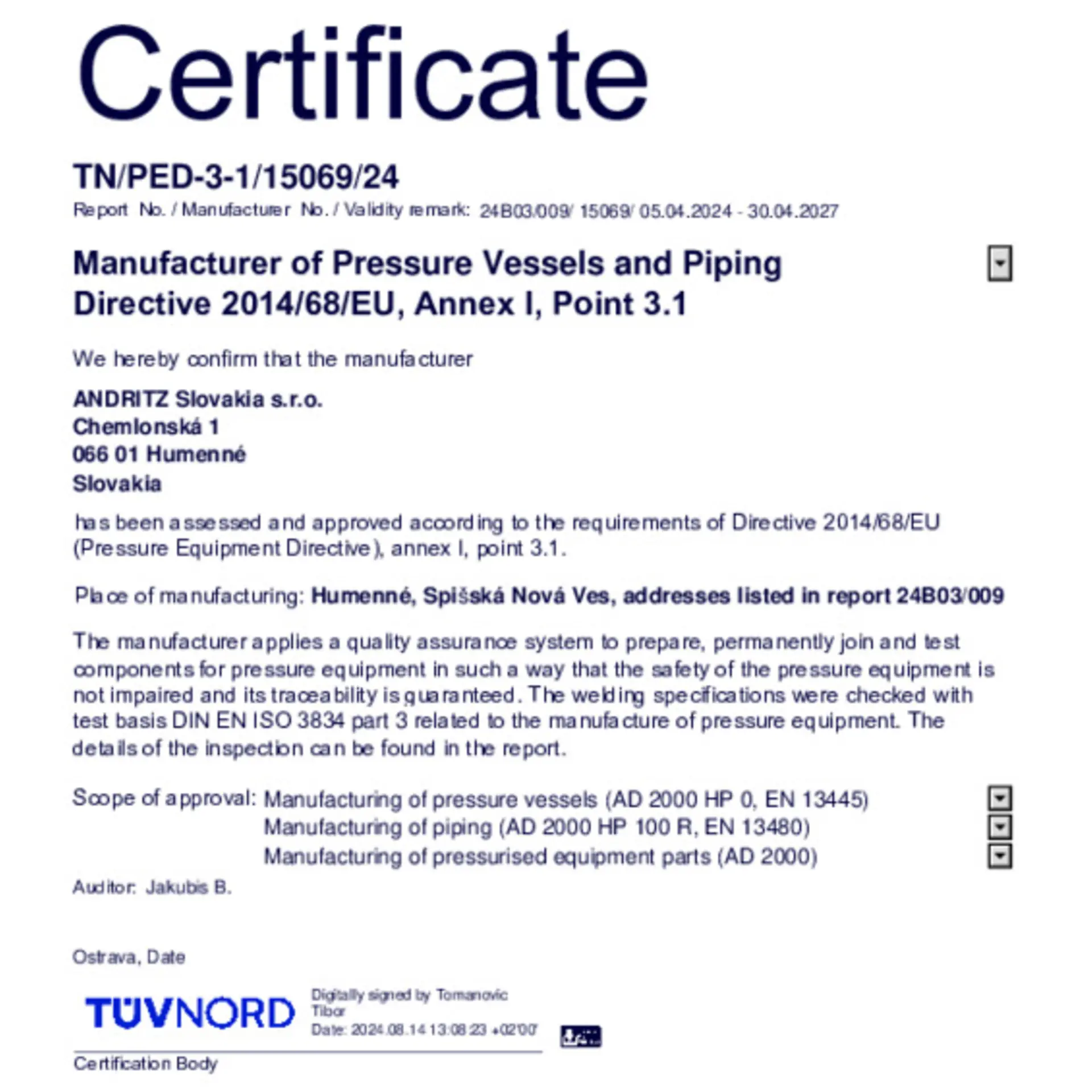 Certificates / Certifikáty Quality Management System welding manufacturer accoring to Directive 2014/68/EU, Annex 1, Point 3.1, Slovakia