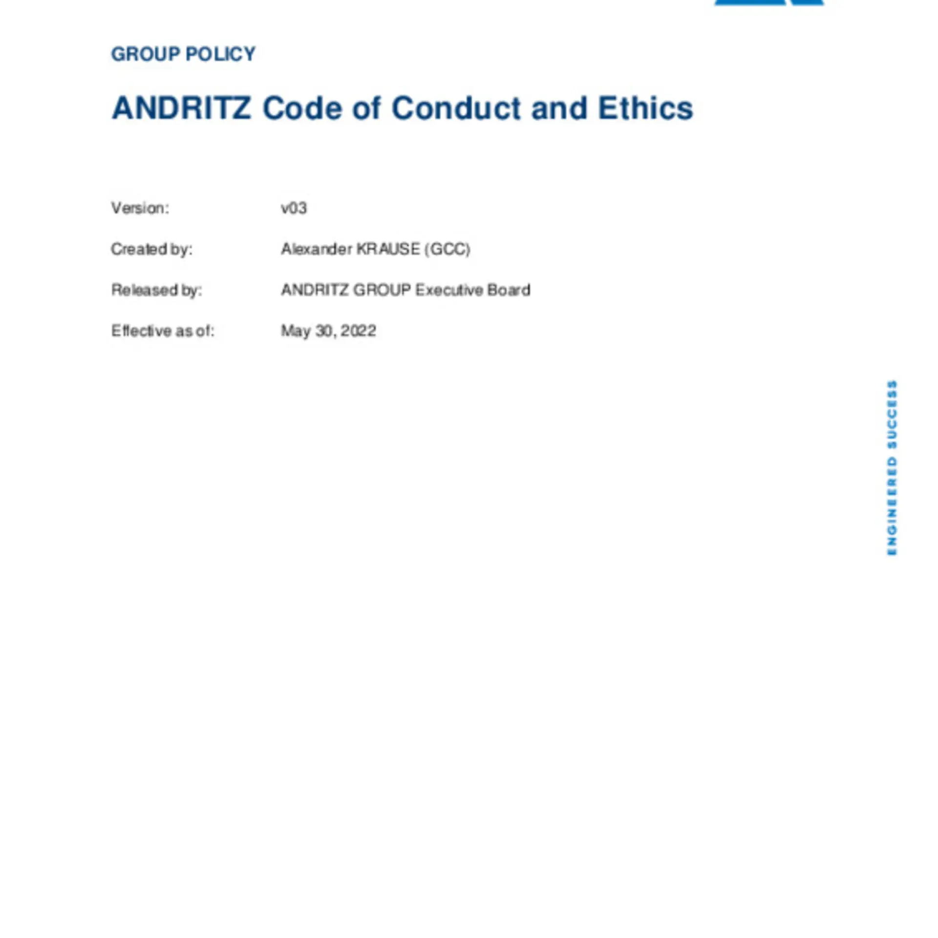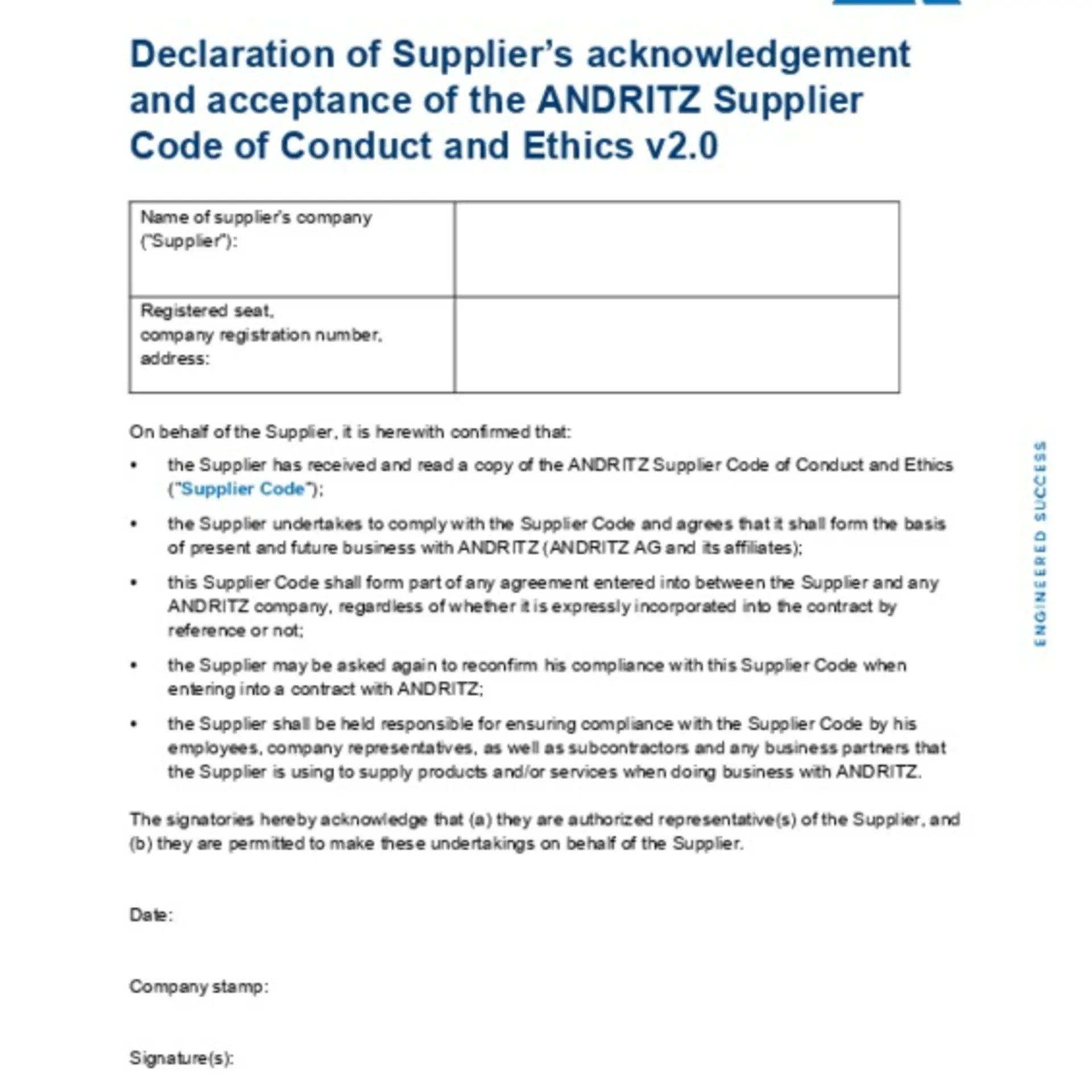 For our Group Compliance Program to succeed, it is important that members of our supply chain adhere to the same values, principles and rules as we do. Many of our customers value the fact that ANDRITZ is making tremendous efforts to ensure that our suppliers comply with our standards of integrity. Suppliers who support the same compliance values and rules will be preferred business partners of our global organization.