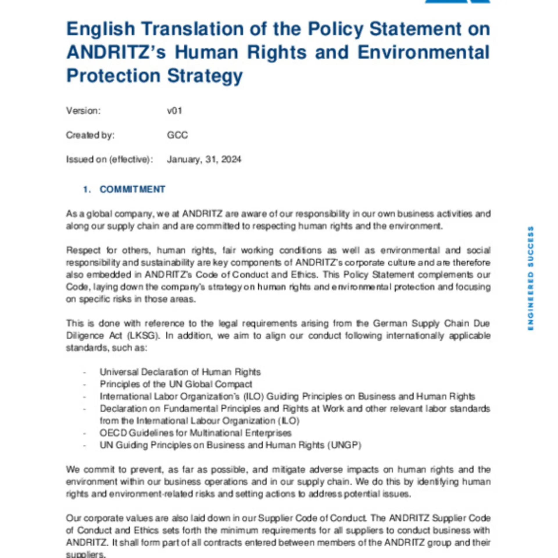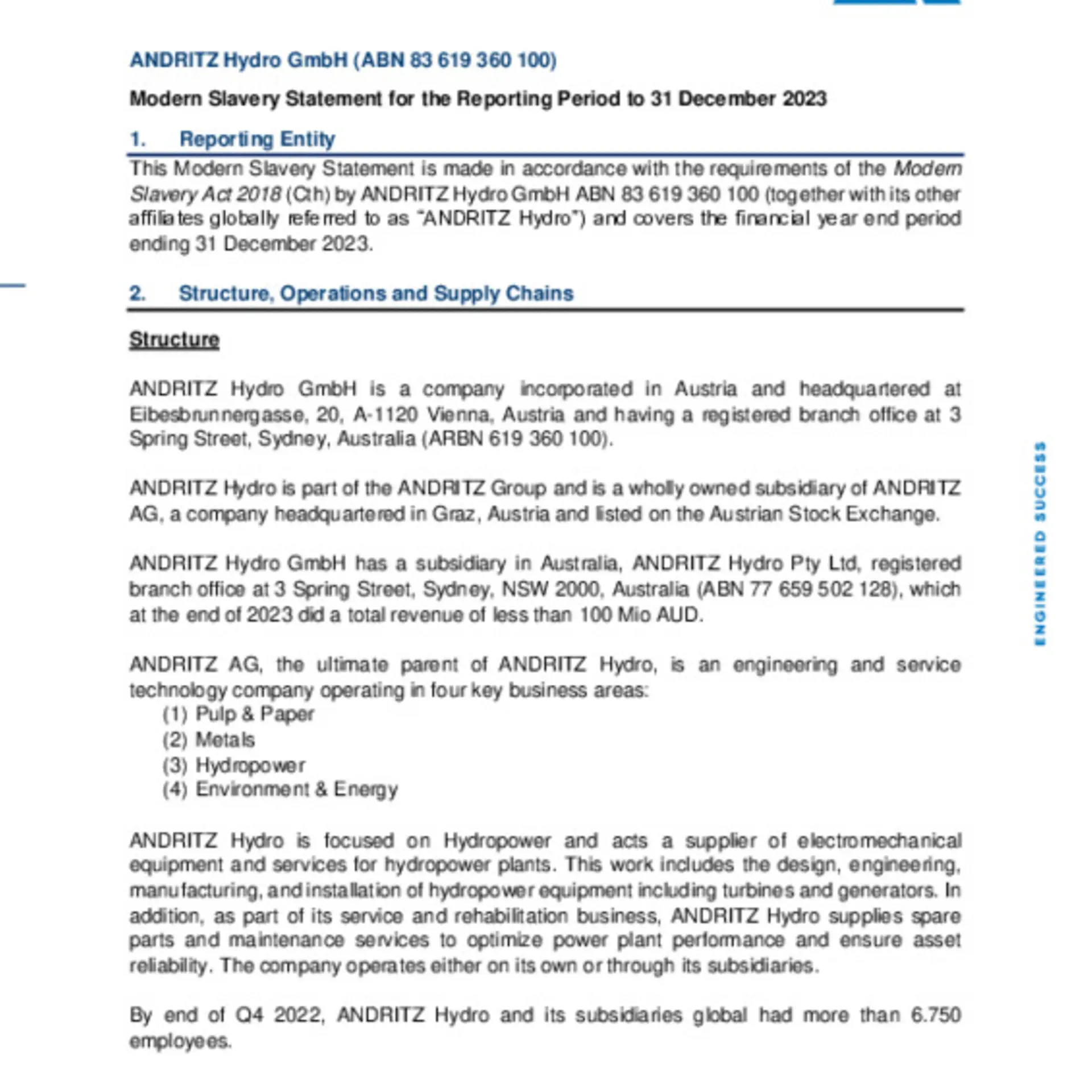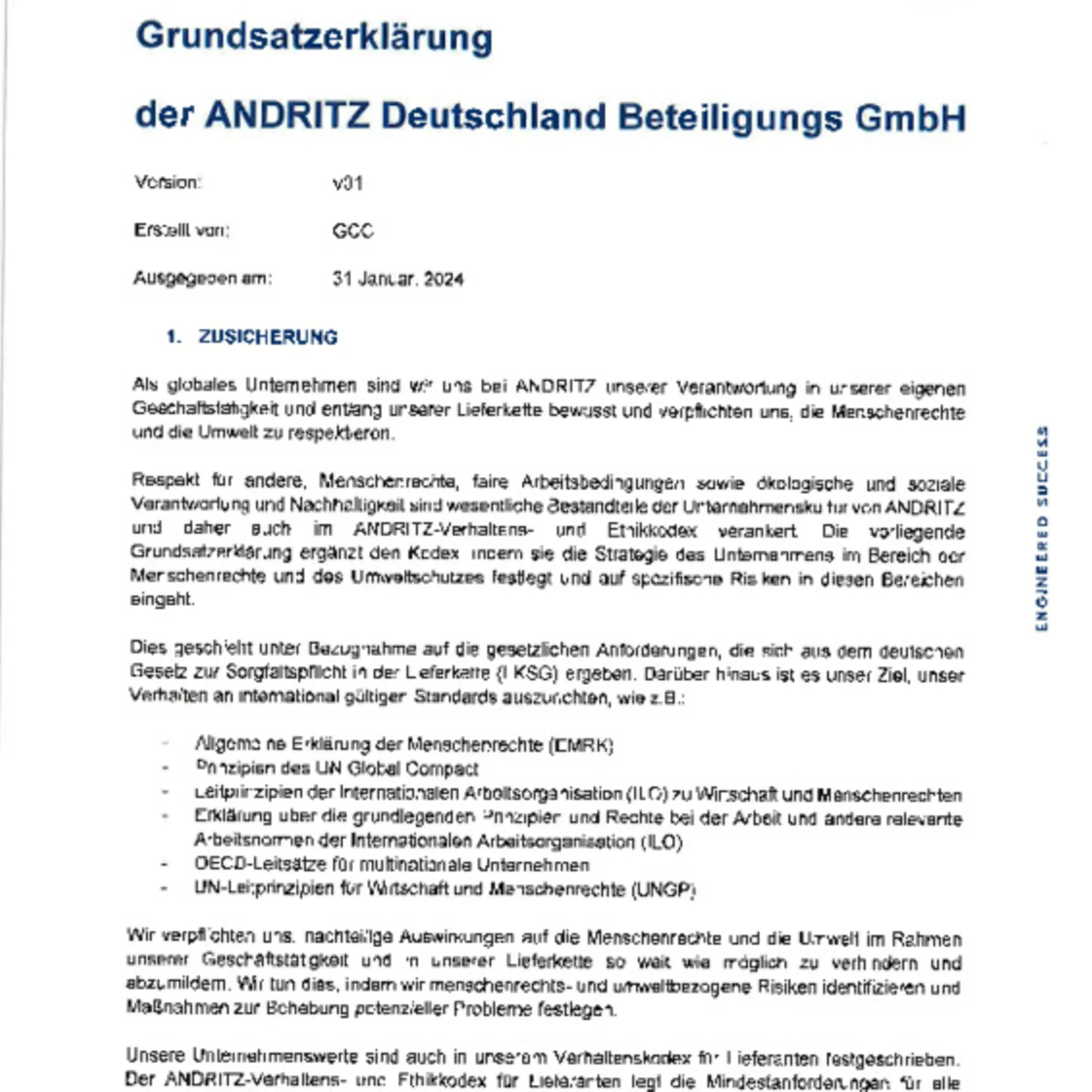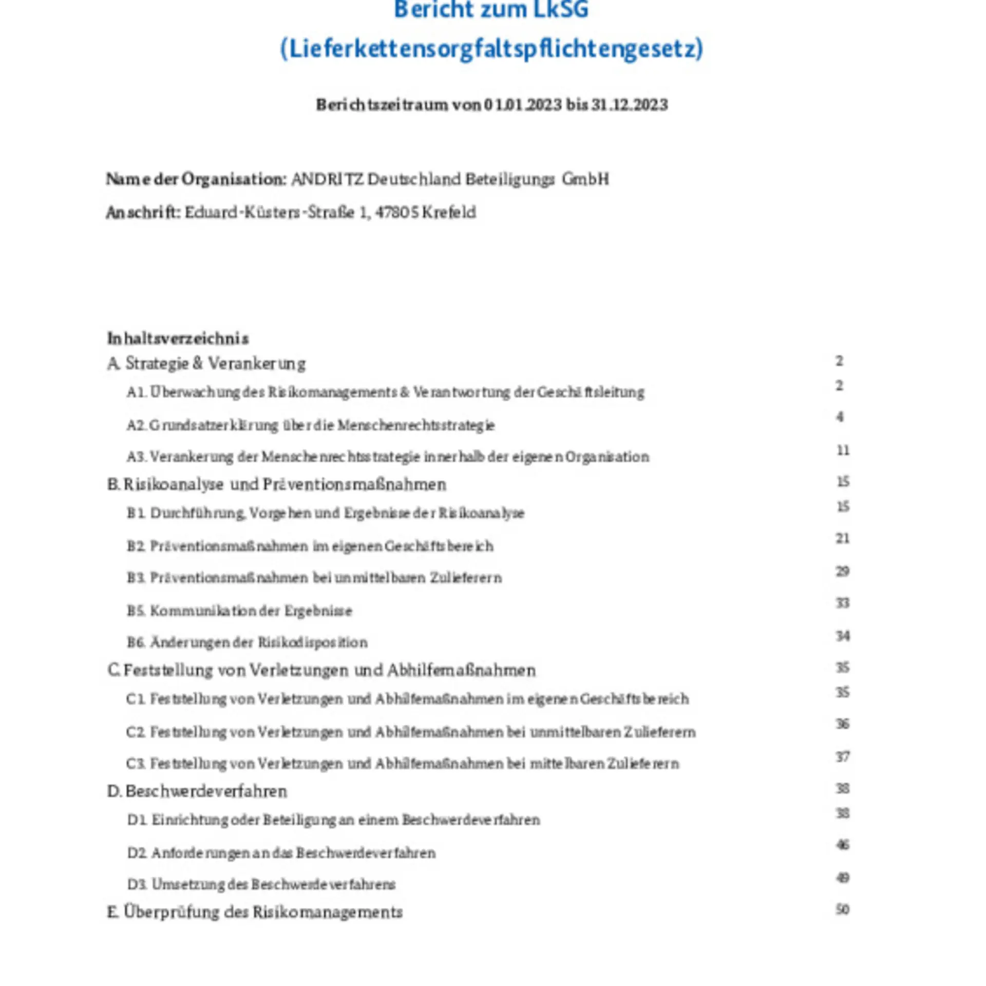 Since January 1, 2023, ANDRITZ Deutschland Beteiligungs GmbH (as a result of aggregating the affiliated subsidiaries) has to implement the requirements of the German Supply Chain Act (LkSG). This law requires companies to comply with certain due diligence obligations in their supply chain and their own business area with regard to human rights and environmental standards. A risk management process with clear responsibilities must be established and regular risk analyses must be carried out. ANDRITZ has had an existing supplier compliance risk program in place for many years already and conducts risk assessments in its own business area through existing processes (e.g., HR onboarding processes). The additional measures taken by ANDRITZ to meet the requirements of the LKSG are explained in more detail below: