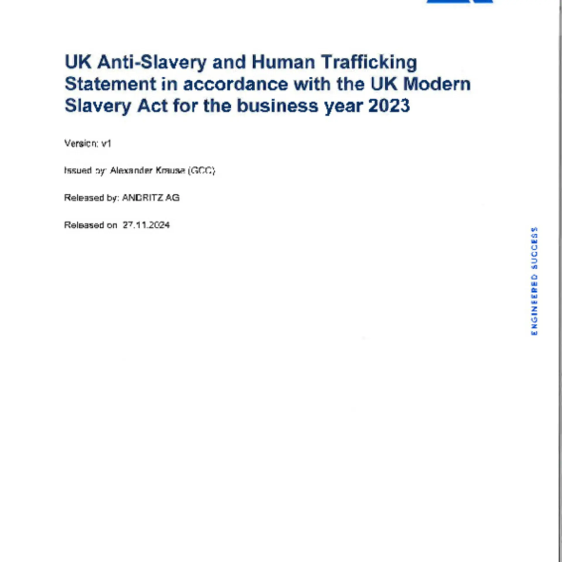 Express reference is made to the published policy statement (Policy Statement of ANDRITZ Deutschland Beteiligungs GmbH).Our Whistleblowing tool, called "Speak UP!", enables anyone to report human rights and environmental risks and (potential) violations arising from the activities of ANDRlTZ or one of our direct or indirect suppliers to the Group Compliance department.