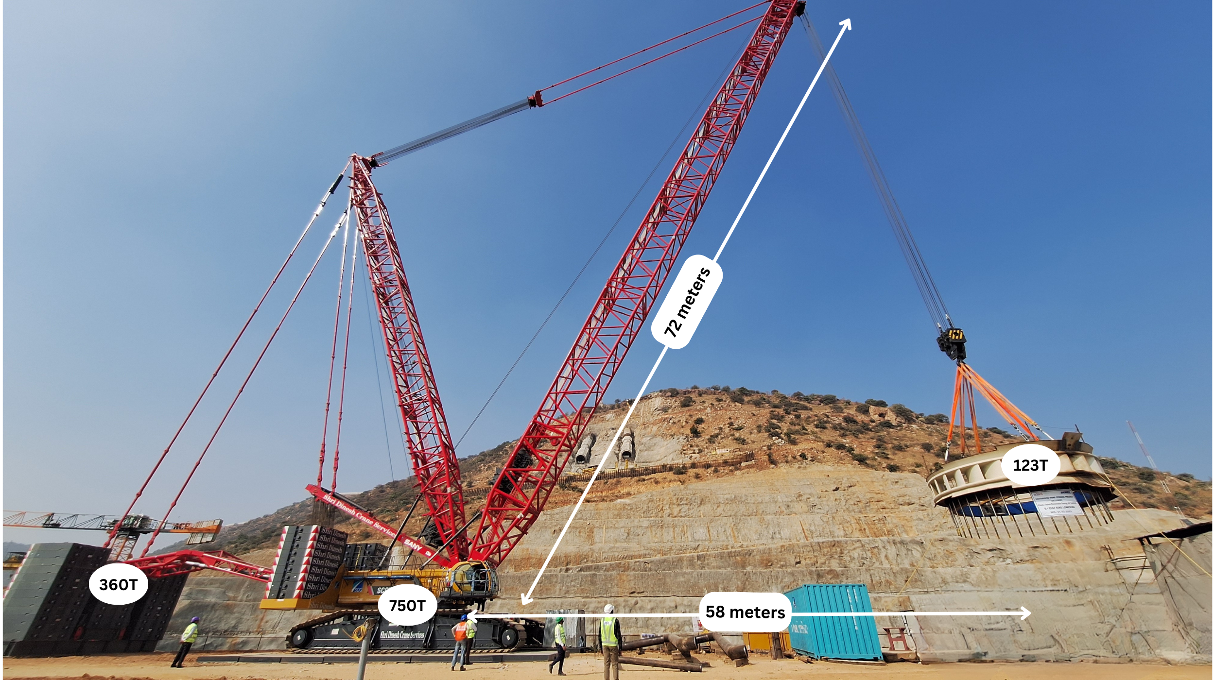 Adding to the complexity, we faced prevailing wind speeds of 20 km/hr, making the task even more challenging. The crane's 59-meter working span and a vertical drop of 72 meters added to the uniqueness of this operation!