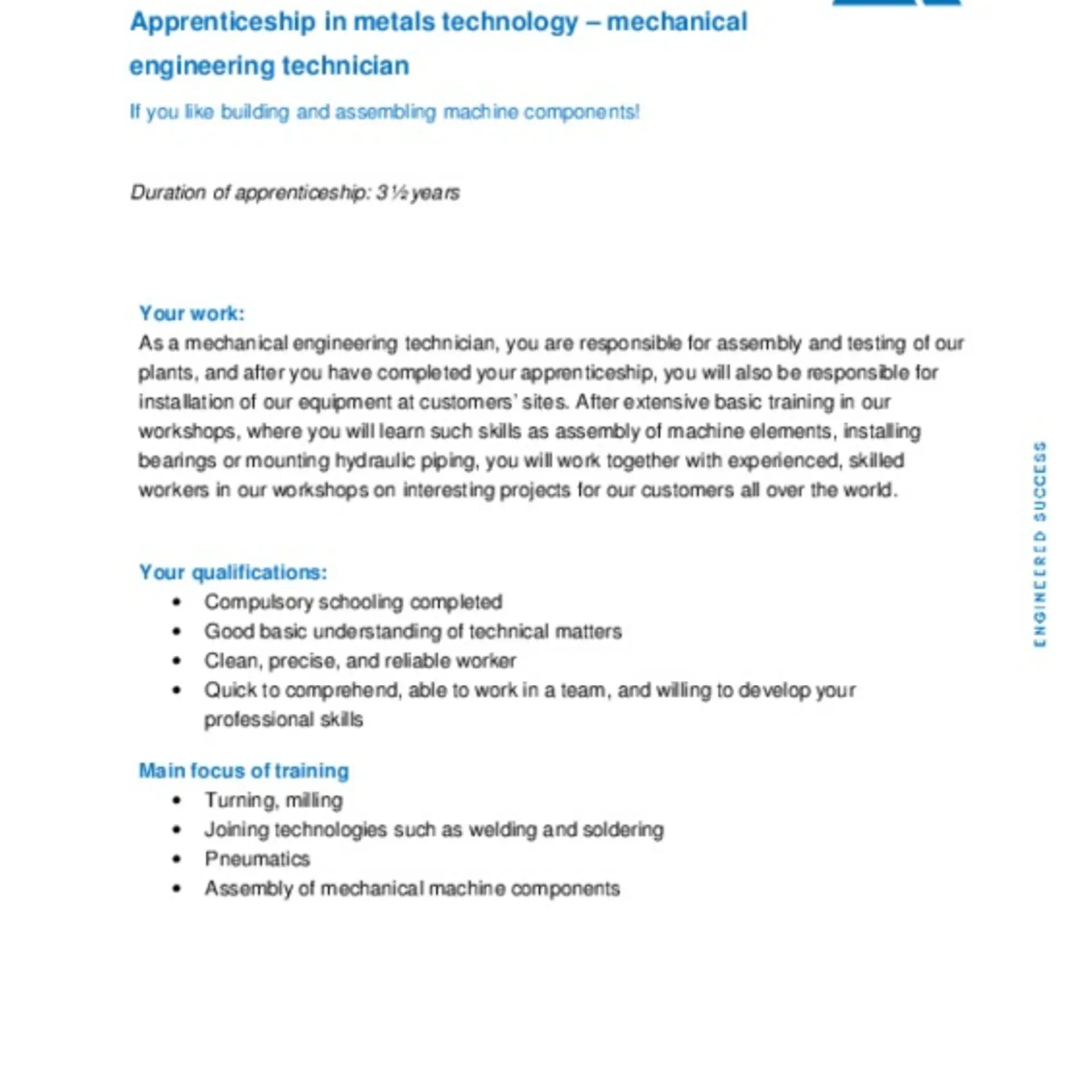 As a mechanical engineering technician, you are responsible for assembly, testing and installation of our plants. You will join machine elements together, build sliding bearings or install hydraulic plant components. In your work, you will use metalworking processes like milling, bolting, drilling, turning, thread-cutting, welding or soldering.