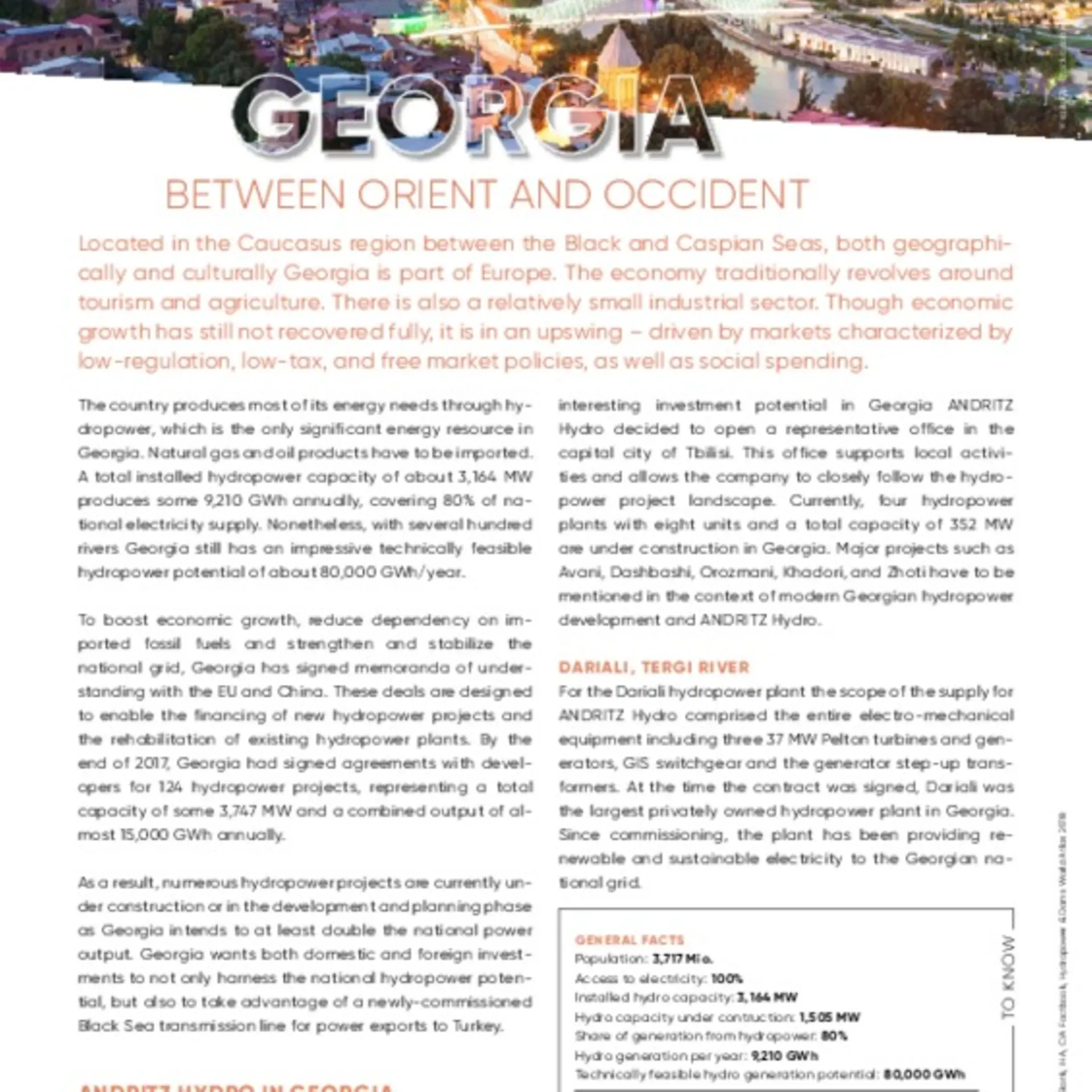 The country produces most of its energy needs through hydropower, which is the only significant energy resource in Georgia. Natural gas and oil products have to be imported. A total installed hydropower capacity of about 3,164 MW