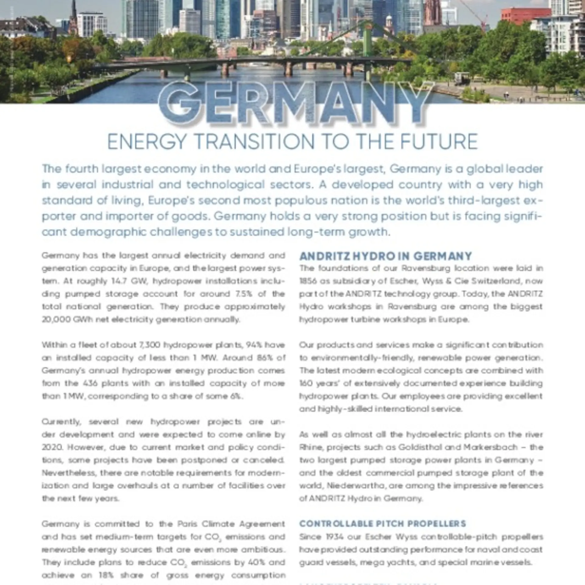 Germany is committed to the Paris Climate Agreement and has set medium-term targets for CO2 emissions and renewable energy sources that are even more ambitious. They include plans to reduce CO2 emissions by 40% and achieve an 18% share of gross energy consumption from renewable sources by 2020. The energy transition (Energiewende) is the transition to a sustainable economy by means of energy efficiency and renewable energy. Alongside wind and solar PV, hydropower will play a major role here.