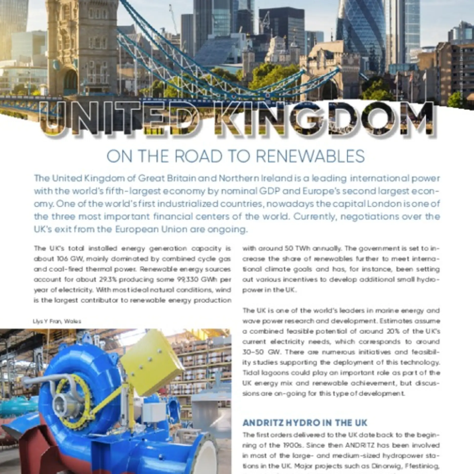 The UK’s total installed energy generation capacity is about 106 GW, mainly dominated by combined cycle gas and coal-fired thermal power. Renewable energy sources account for about 29.3% producing some 99,330 GWh per year of electricity. With most ideal natural conditions, wind is the largest contributor to renewable energy production with around 50 TWh annually. The government is set to increase the share of renewables further to meet international climate goals and has, for instance, been setting out various incentives to develop additional small hydropower in the UK.