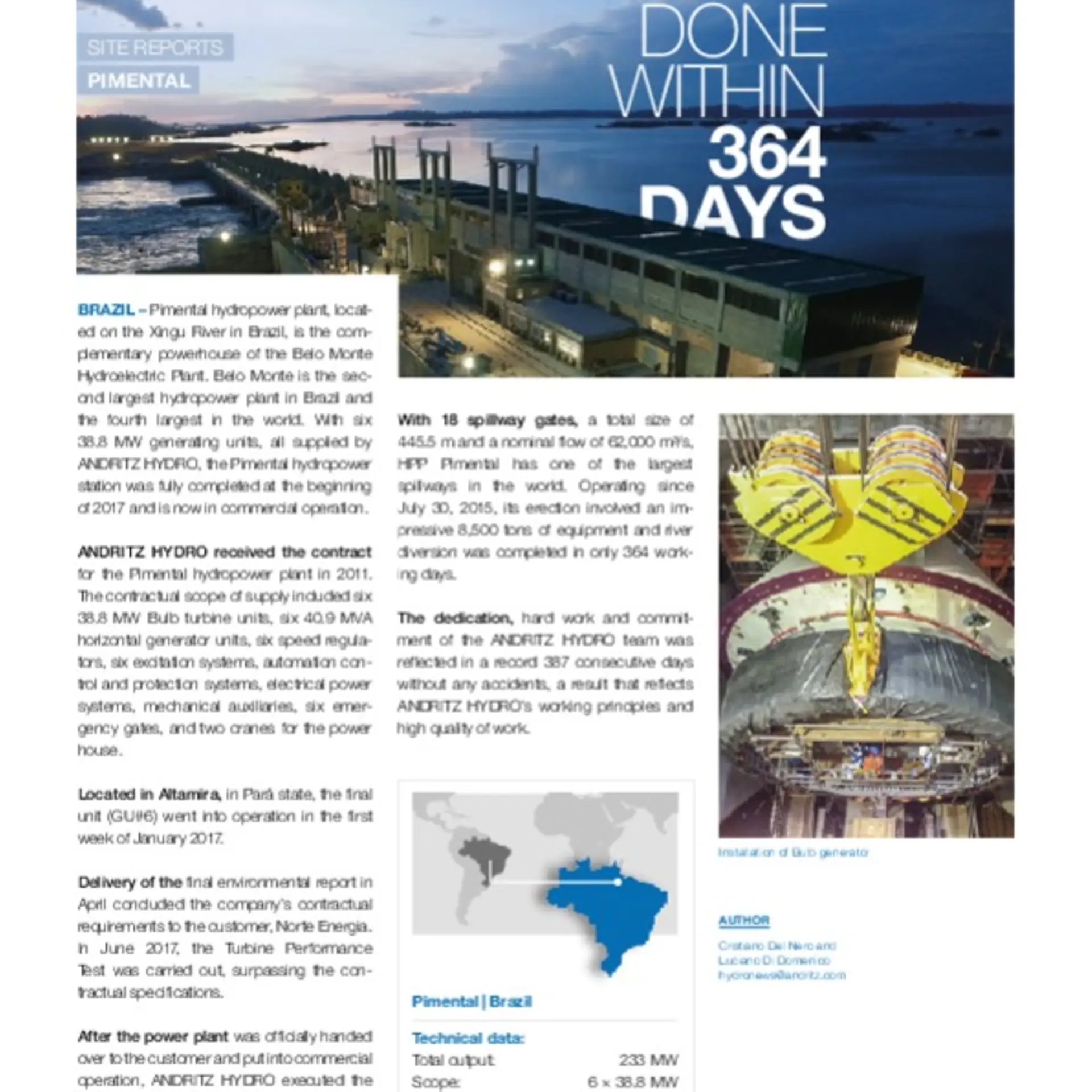 Pimental hydropower plant, located on the Xingu River in Brazil, is the complementary powerhouse of the Belo Monte Hydroelectric Plant. Belo Monte is the second largest hydropower plant in Brazil and the fourth largest in the world. With six 38.8 MW generating units, all supplied by ANDRITZ HYDRO, the Pimental hydropower station was fully completed at the beginning of 2017 and is now in commercial operation.