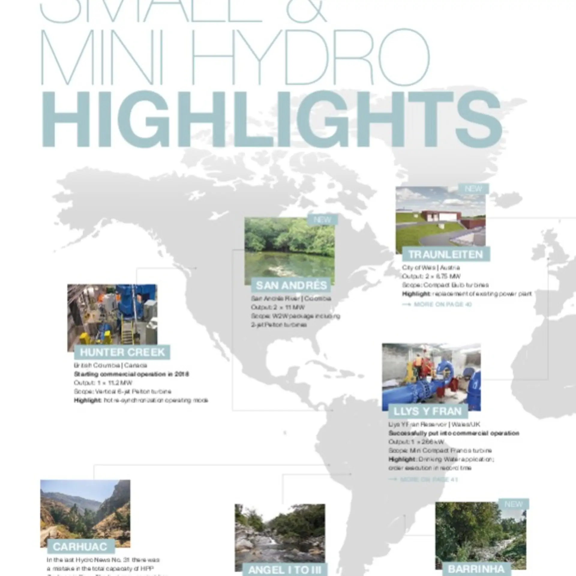 In the last Hydro News No. 31 there was a mistake in the total capacaty of HPP Carhuac in Peru. The hydropower plant has a total output of 20 MW. Updated status: erection ongoing; expected commissioning during first 1st half of 2018
