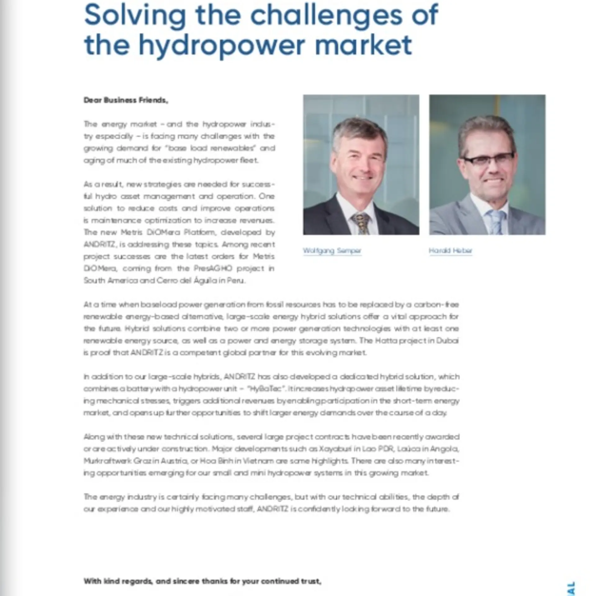 At a time when baseload power generation from fossil resources has to be replaced by a carbon-free renewable energy-based alternative, large-scale energy hybrid solutions offer a vital approach for the future. Hybrid solutions combine two or more power generation technologies with at least one renewable energy source, as well as a power and energy storage system. The Hatta project in Dubai is proof that ANDRITZ is a competent global partner for this evolving market.