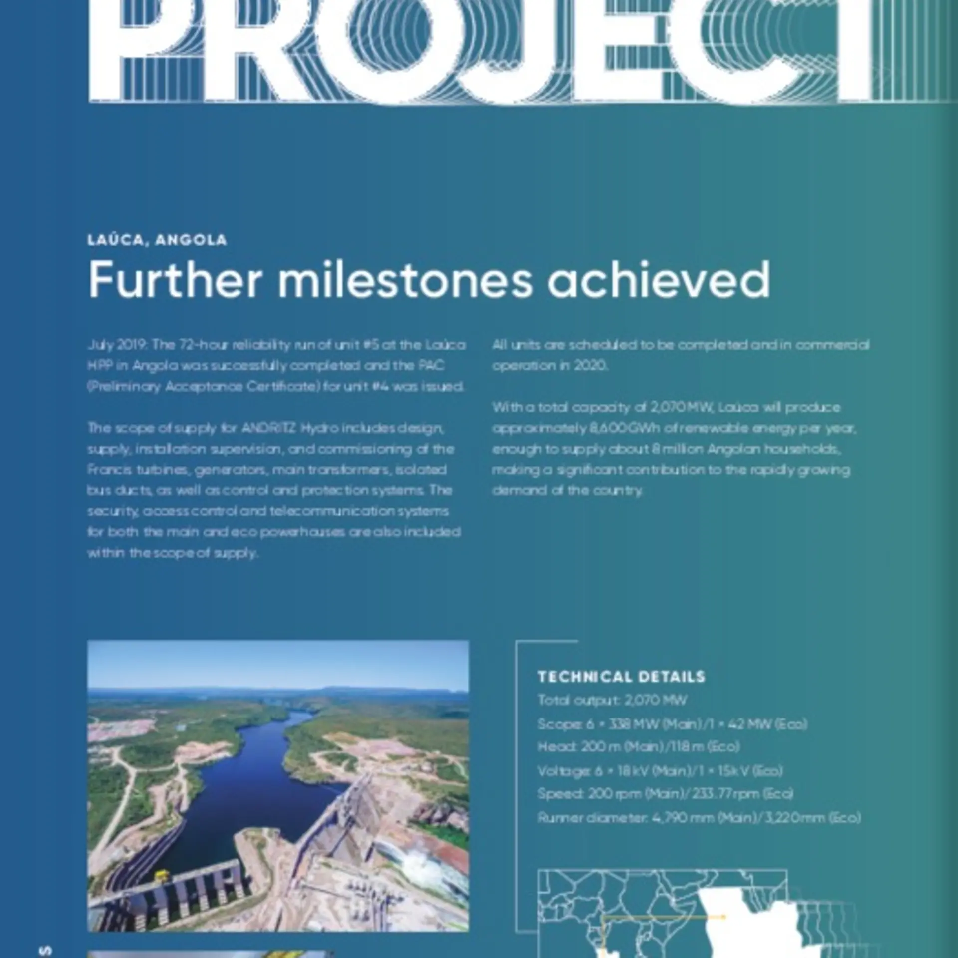 With a total capacity of 2,070 MW, Laúca will produce approximately 8,600 GWh of renewable energy per year, enough to supply about 8 million Angolan households, making a significant contribution to the rapidly growing demand of the country.