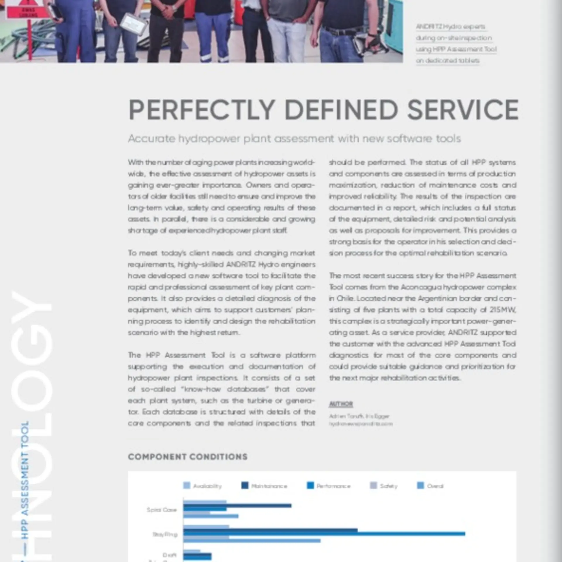 The most recent success story for the HPP Assessment Tool comes from the Aconcagua hydropower complex in Chile. Located near the Argentinian border and consisting of five plants with a total capacity of 215 MW, this complex is a strategically important power-generating asset. As a service provider, ANDRITZ supported the customer with the advanced HPP Assessment Tool diagnostics for most of the core components and could provide suitable guidance and prioritization for the next major rehabilitation activities.