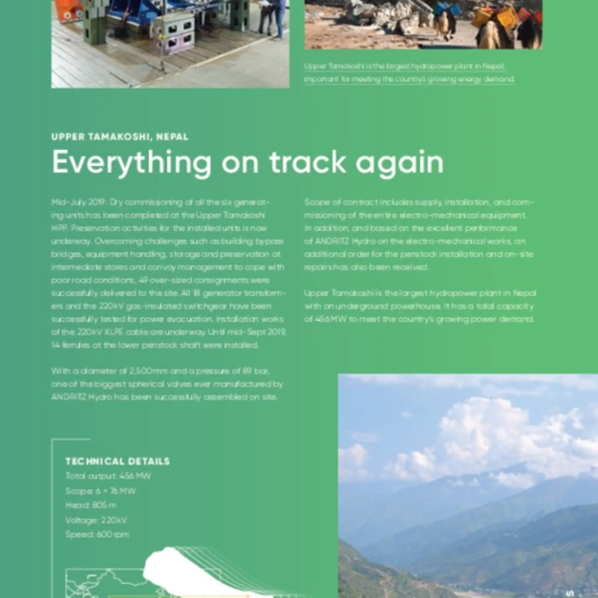 Mid-July 2019: Dry commissioning of all the six generating units has been completed at the Upper Tamakoshi HPP. Preservation activities for the installed units is now underway.