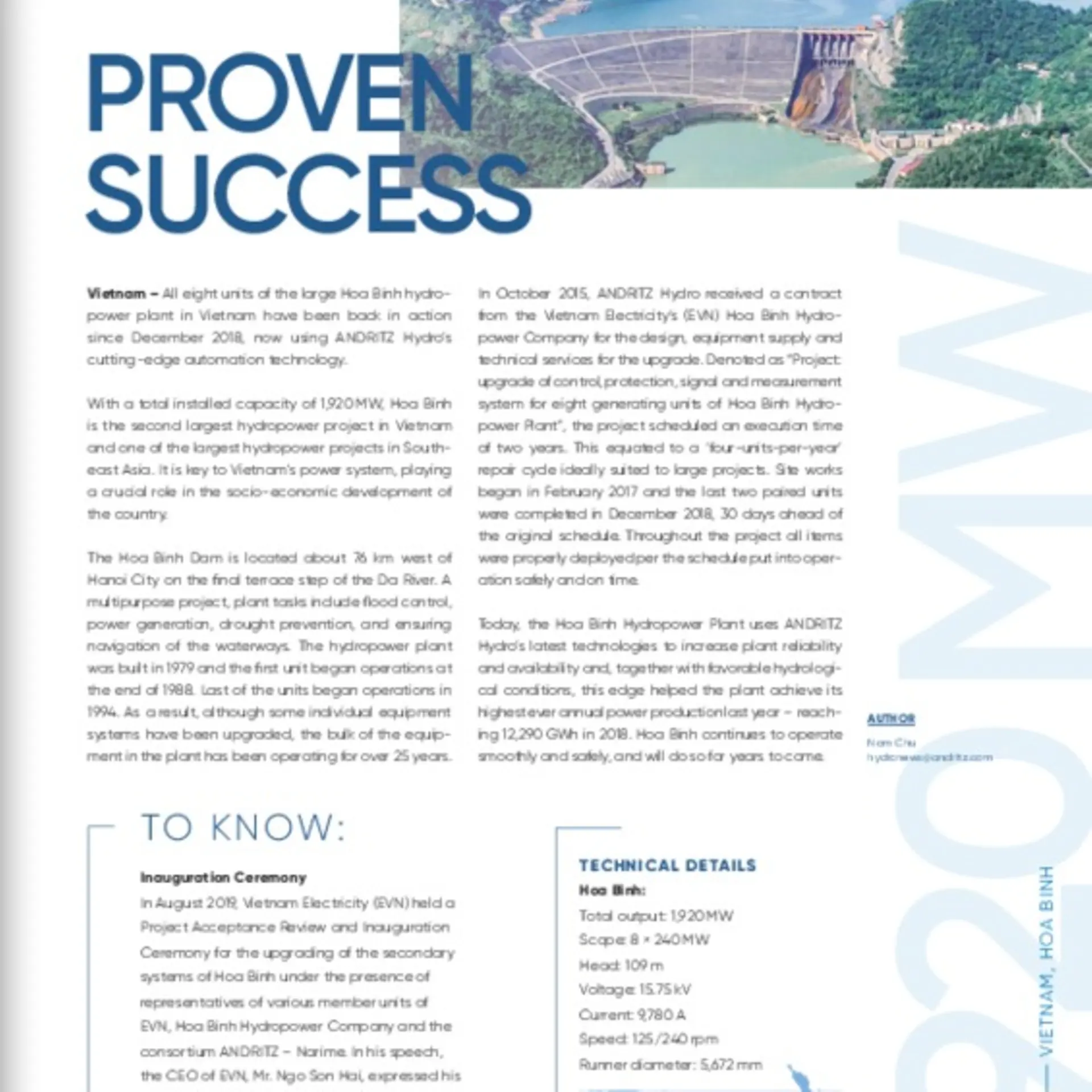 In August 2019, Vietnam Electricity (EVN) held a Project Acceptance Review and Inauguration Ceremony for the upgrading of the secondary systems of Hoa Binh under the presence of representatives of various member units of EVN, Hoa Binh Hydropower Company and the consortium ANDRITZ – Narime. In his speech, the CEO of EVN, Mr. Ngo Son Hai, expressed his delight to see immediate impacts of the newly upgraded systems, conveyed his compliment and thanks to the consortium on its performance, and appreciated the efforts of the whole project team.