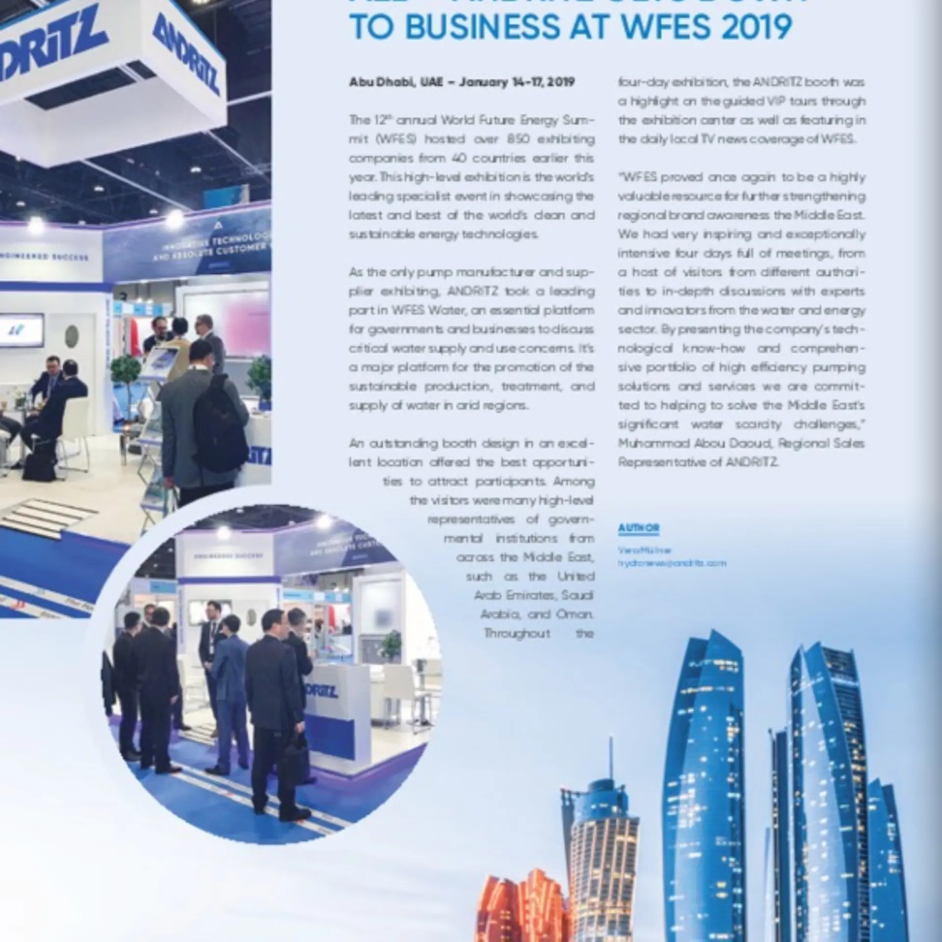 “WFES proved once again to be a highly valuable resource for further strengthening regional brand awareness the Middle East. We had very inspiring and exceptionally intensive four days full of meetings, from a host of visitors from different authorities to in-depth discussions with experts and innovators from the water and energy sector. By presenting the company's technological know-how and comprehensive portfolio of high efficiency pumping solutions and services we are committed to helping to solve the Middle East's significant water scarcity challenges,” Muhammad Abou Daoud, Regional Sales Representative of ANDRITZ.