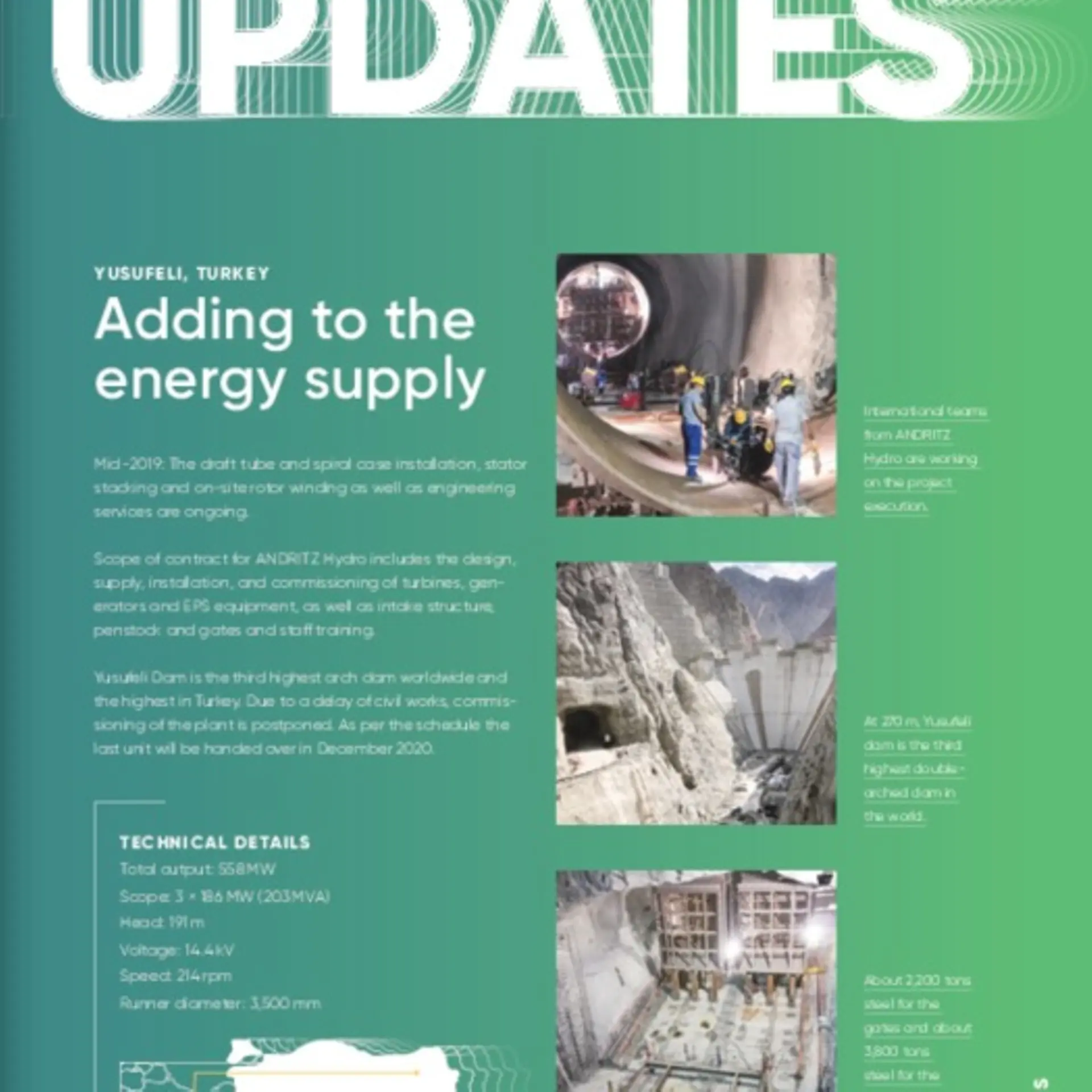 Yusufeli Dam is the third highest arch dam worldwide and the highest in Turkey. Due to a delay of civil works, commissioning of the plant is postponed. As per the schedule the last unit will be handed over in December 2020.