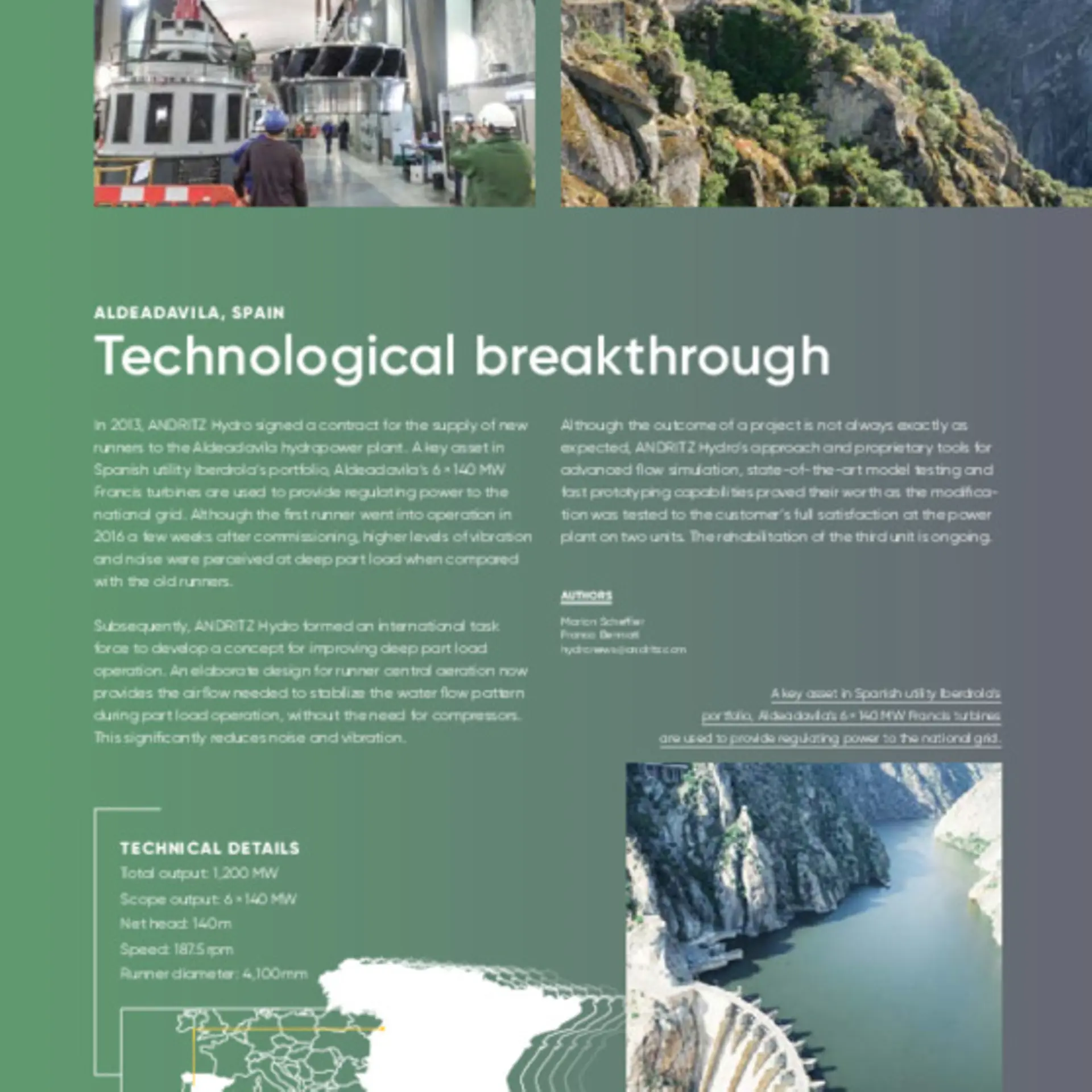 In 2013, ANDRITZ Hydro signed a contract for the supply of new runners to the Aldeadavila hydropower plant. A key asset in Spanish utility Iberdrola’s portfolio, Aldeadavila’s 6 × 140 MW Francis turbines are used to provide regulating power to the national grid. Although the first runner went into operation in 2016 a few weeks after commissioning, higher levels of vibration and noise were perceived at deep part load when compared with the old runners.