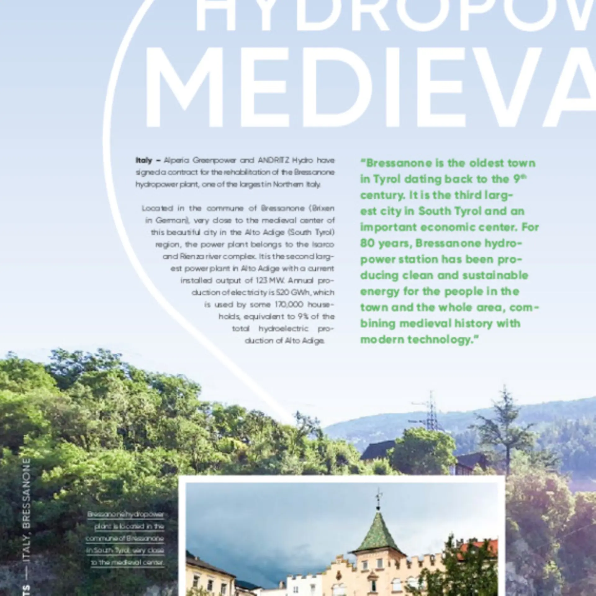 Bressanone is one of the largest projects to be awarded to ANDRITZ Hydro in Italy in decades and follows the successful completion of several contracts recently performed with Alperia, including San Pancrazio, Lappago, Molini di Tures and many other smaller projects. This makes Alperia one of the most relevant customers for ANDRITZ Hydro, not only in Italy but across the whole Europe.