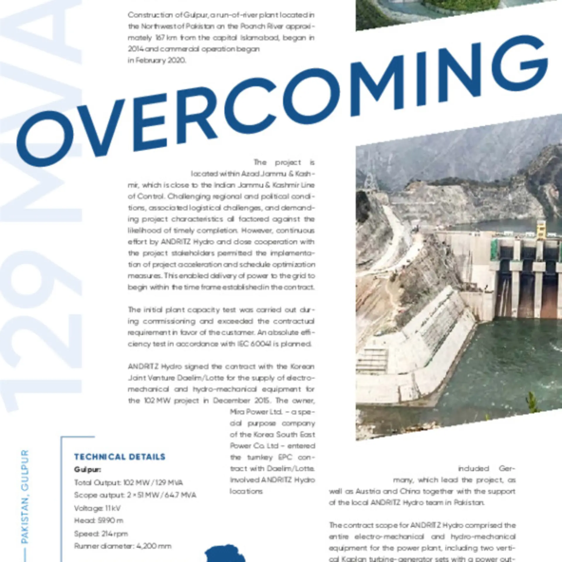 The project is located within Azad Jammu & Kashmir, which is close to the Indian Jammu & Kashmir Line of Control. Challenging regional and political conditions, associated logistical challenges, and demanding project characteristics all factored against the likelihood of timely completion. However, continuous effort by ANDRITZ Hydro and close cooperation with the project stakeholders permitted the implementation of project acceleration and schedule optimization measures. This enabled delivery of power to the grid to begin within the time frame established in the contract.