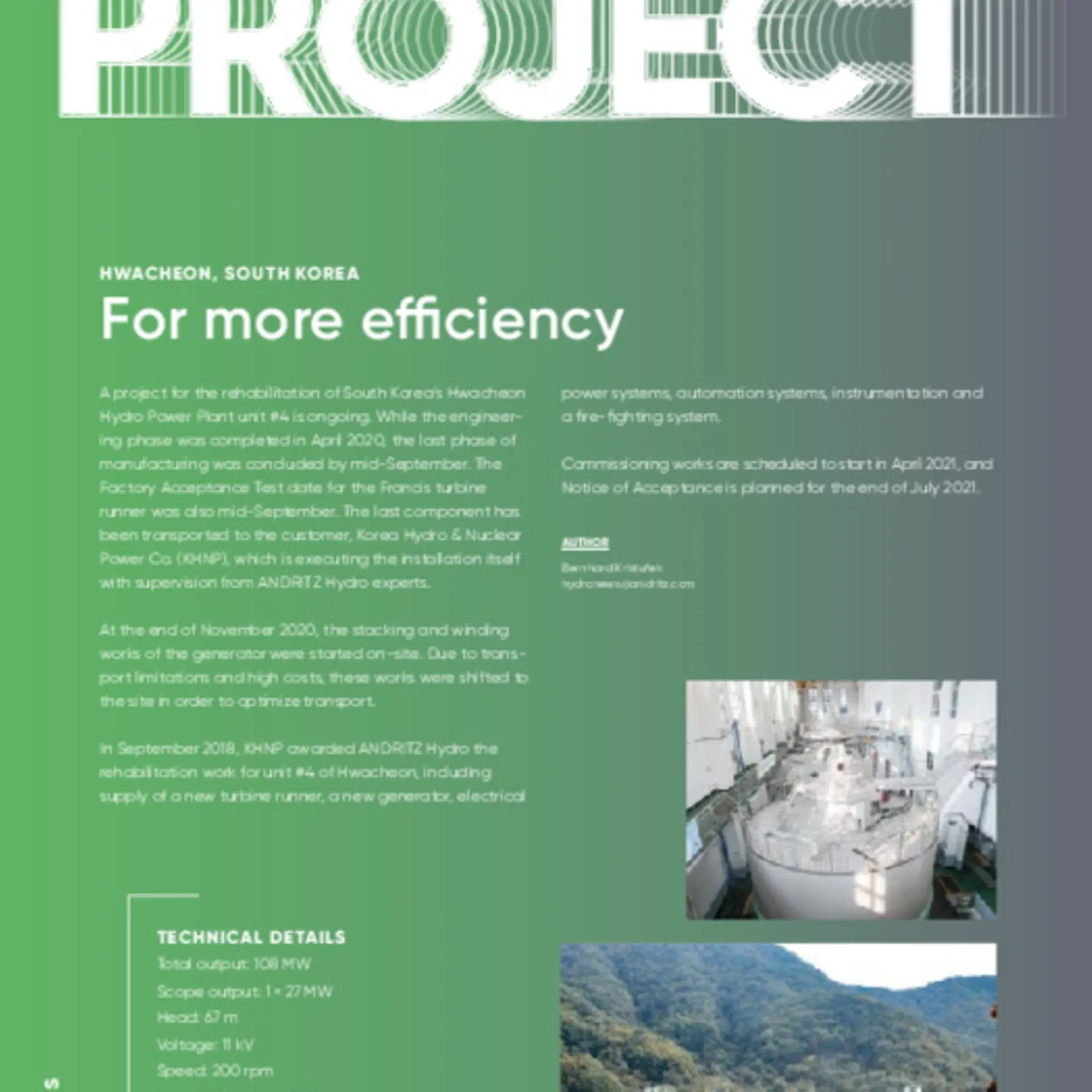 A project for the rehabilitation of South Korea’s Hwacheon Hydro Power Plant unit #4 is ongoing.