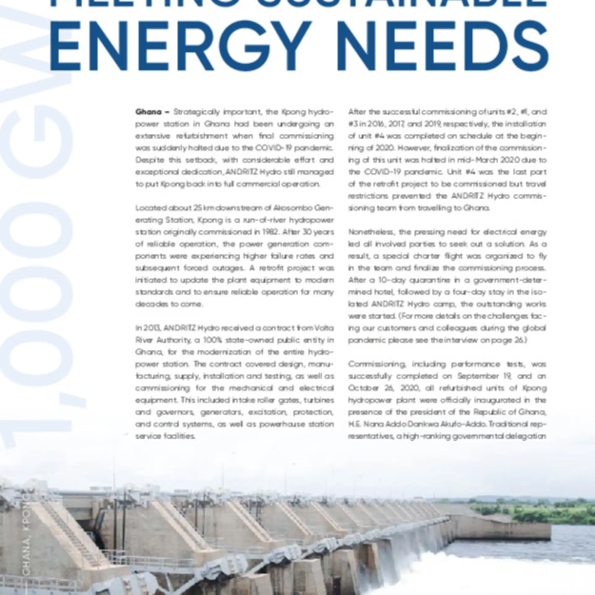 Commissioning, including performance tests, was successfully completed on September 19, and on October 26, 2020, all refurbished units of Kpong hydropower plant were officially inaugurated in the presence of the president of the Republic of Ghana, H.E. Nana Addo Dankwa Akufo-Addo. Traditional representatives, a high-ranking governmental delegation and international guests also attended the inauguration. Now, all four units of the Kpong hydropower plant are again fully operational to the utmost satisfaction of the customer.