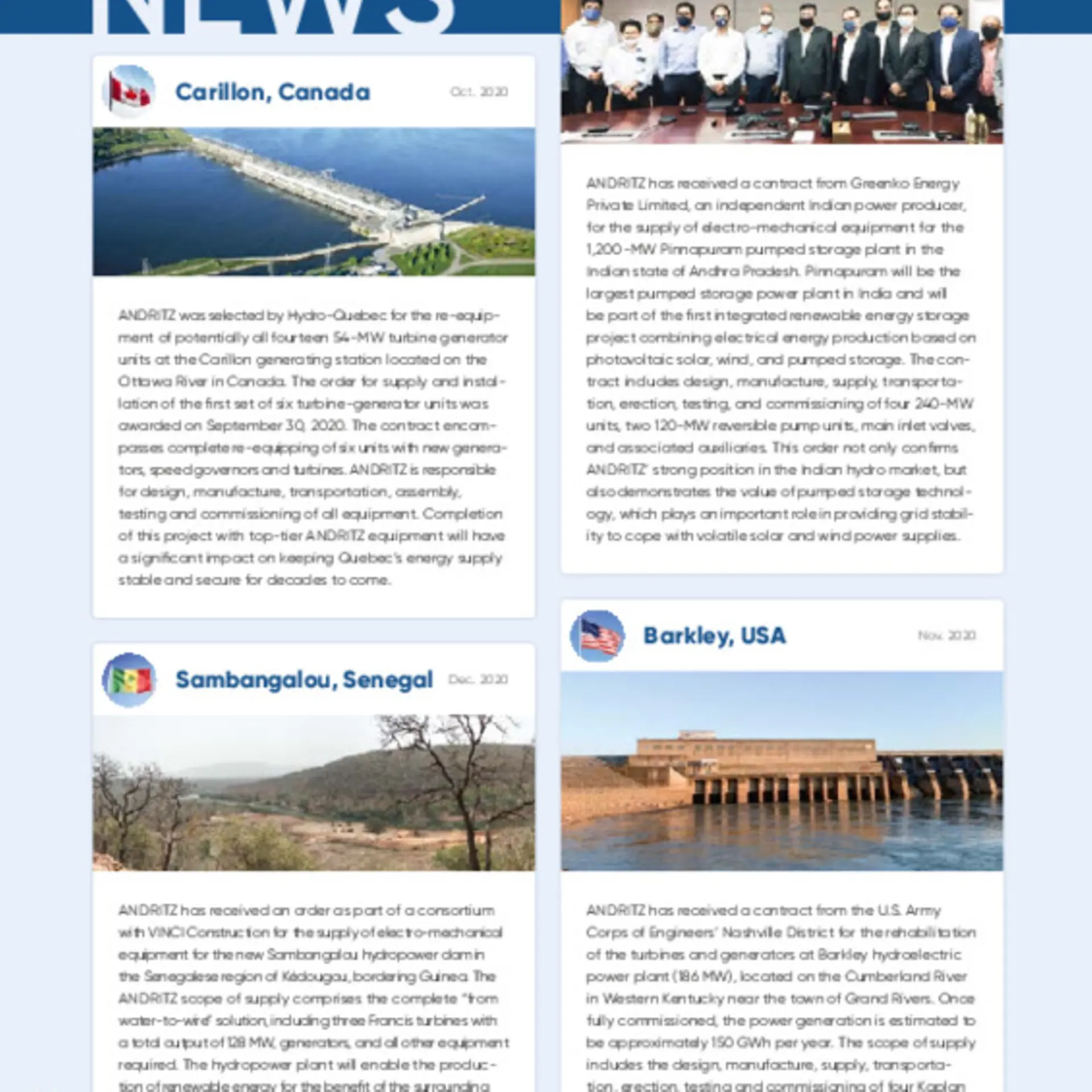 ANDRITZ was selected by Hydro-Quebec for the re-equipment of potentially all fourteen 54-MW turbine generator units at the Carillon generating station located on the Ottawa River in Canada. The order for supply and installation of the first set of six turbine-generator units was awarded on September 30, 2020. The contract encompasses complete re-equipping of six units with new generators, speed governors and turbines. ANDRITZ is responsible for design, manufacture, transportation, assembly, testing and commissioning of all equipment. Completion of this project with top-tier ANDRITZ equipment will have a significant impact on keeping Quebec’s energy supply stable and secure for decades to come.