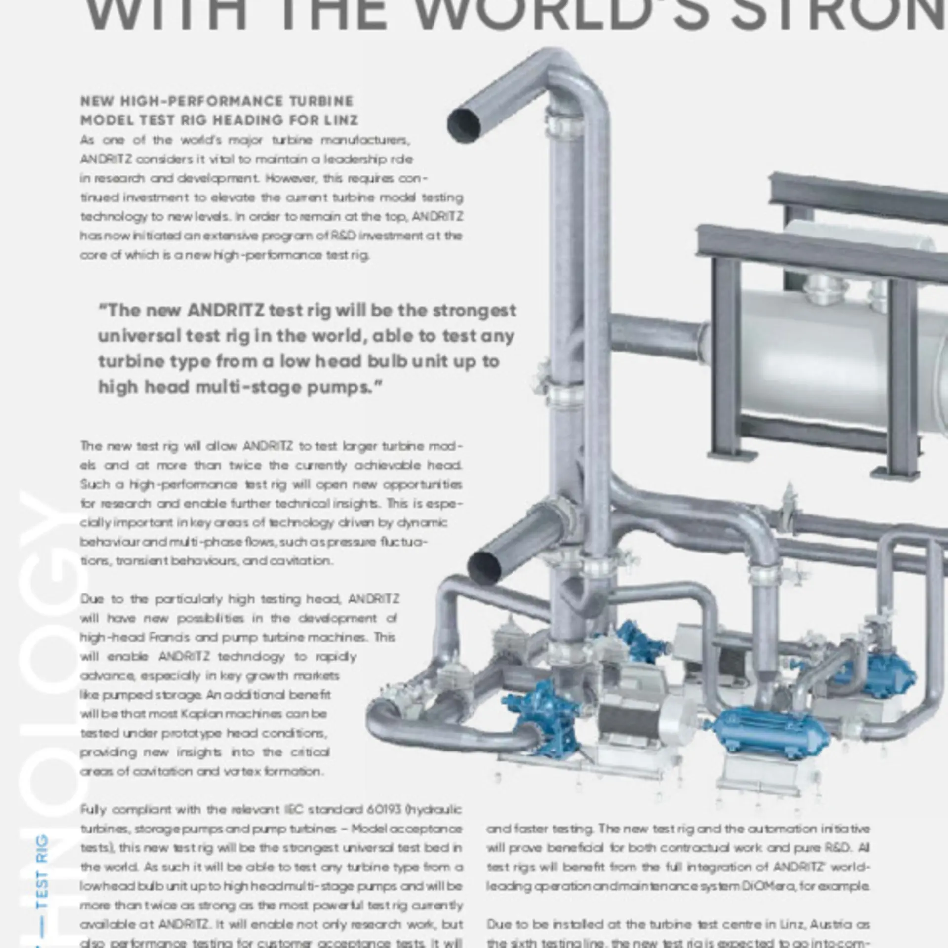 As one of the world’s major turbine manufacturers, ANDRITZ considers it vital to maintain a leadership role in research and development. However, this requires continued investment to elevate the current turbine model testing technology to new levels. In order to remain at the top, ANDRITZ has now initiated an extensive program of R&D investment at the core of which is a new high-performance test rig.