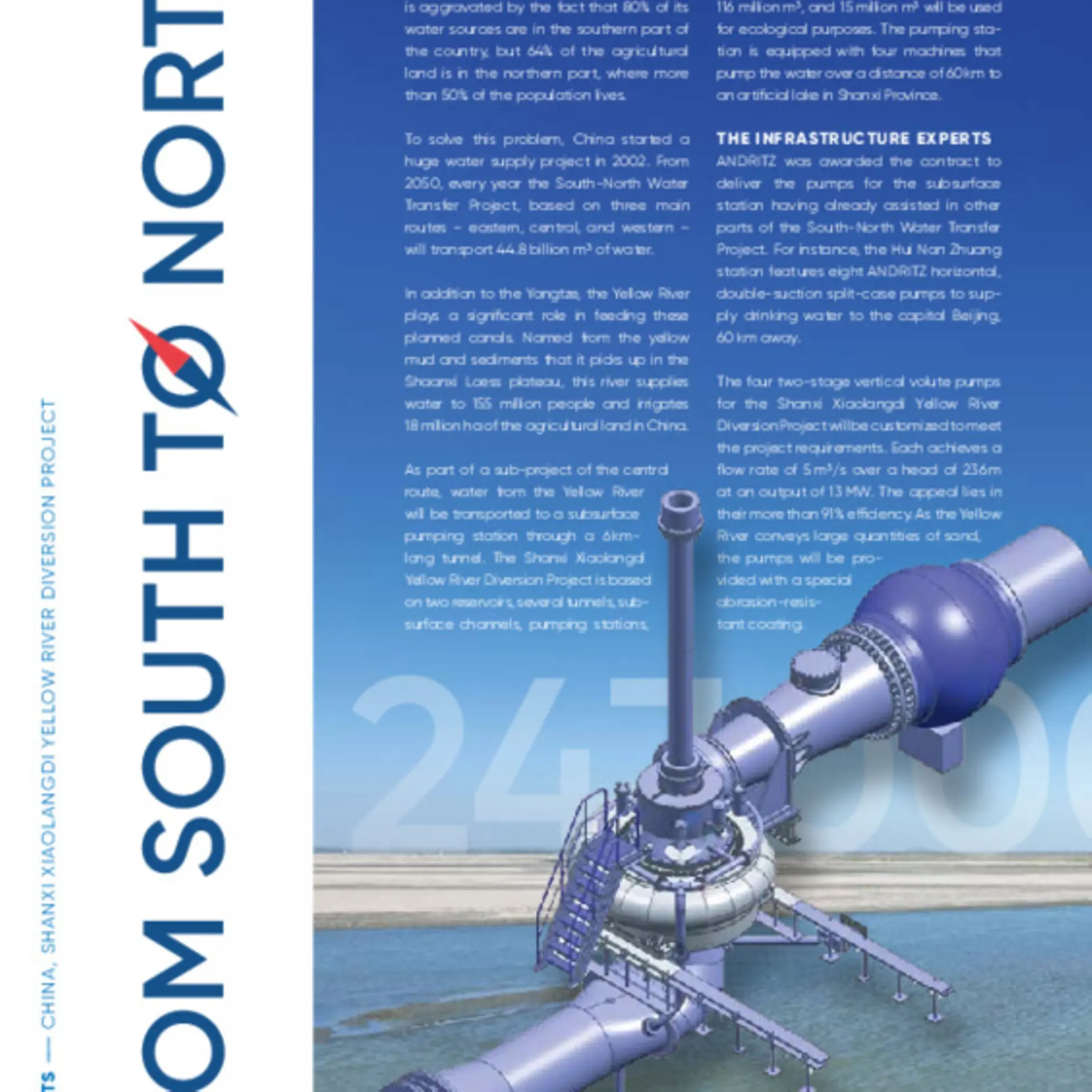 ANDRITZ was awarded the contract to deliver the pumps for the subsurface station having already assisted in other parts of the South-North Water Transfer Project. For instance, the Hui Nan Zhuang station features eight ANDRITZ horizontal, double-suction split-case pumps to supply drinking water to the capital Beijing,