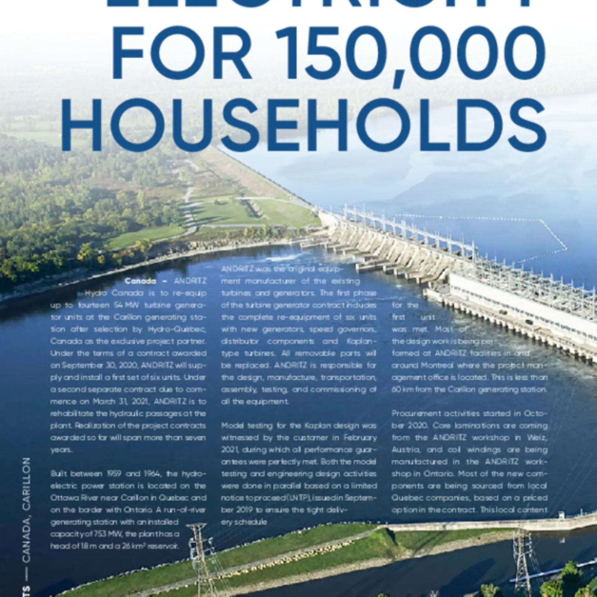 ANDRITZ Hydro Canada is to re-equip up to fourteen 54 MW turbine generator units at the Carillon generating station after selection by Hydro-Québec, Canada as the exclusive project partner. Under the terms of a contract awarded on September 30, 2020, ANDRITZ will supply and install a first set of six units. Under a second separate contract due to commence on March 31, 2021, ANDRITZ is to rehabilitate the hydraulic passages at the plant. Realization of the project contracts awarded so far will span more than seven years.