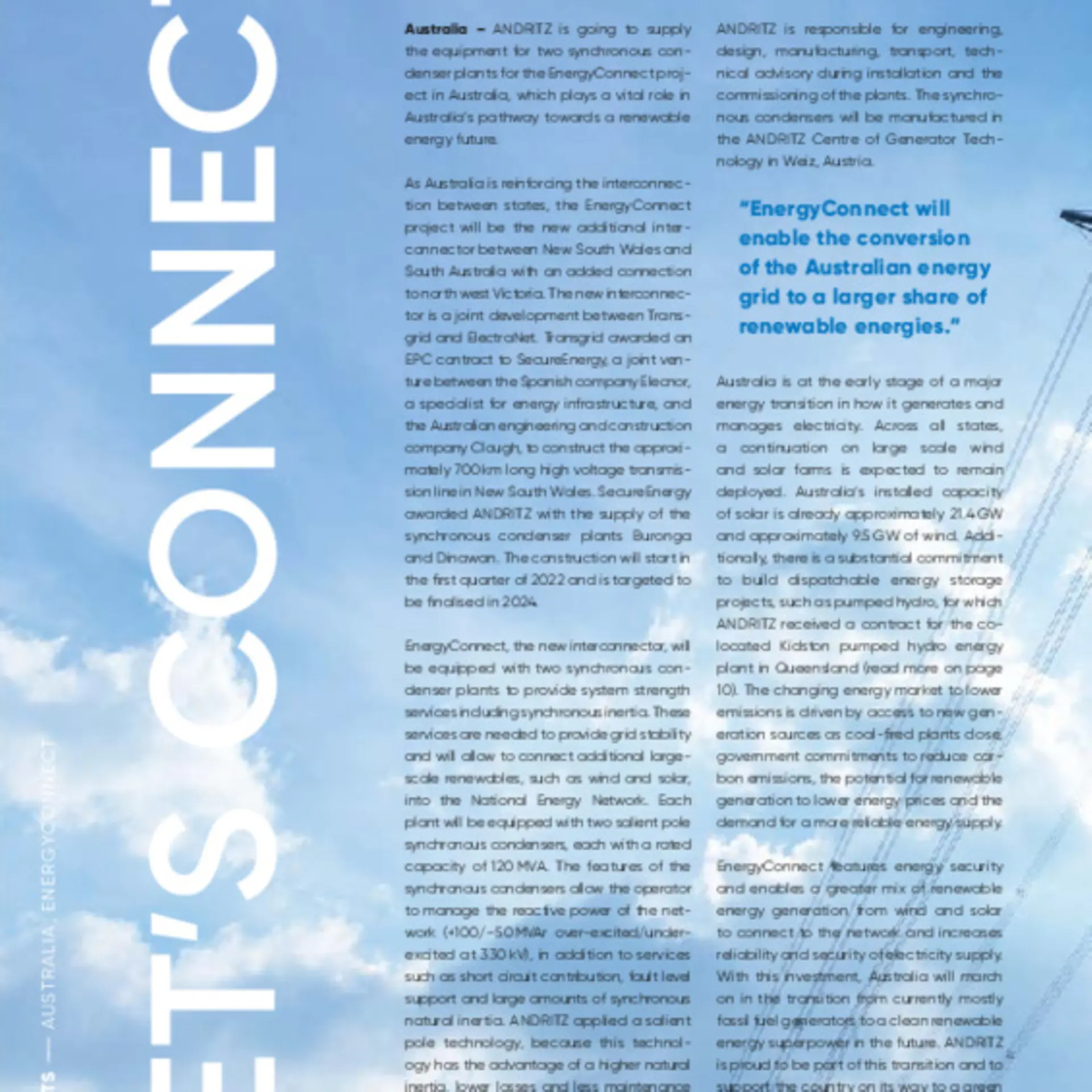 ANDRITZ is going to supply the equipment for two synchronous condenser plants for the EnergyConnect project in Australia, which plays a vital role in Australia’s pathway towards a renewable energy future.