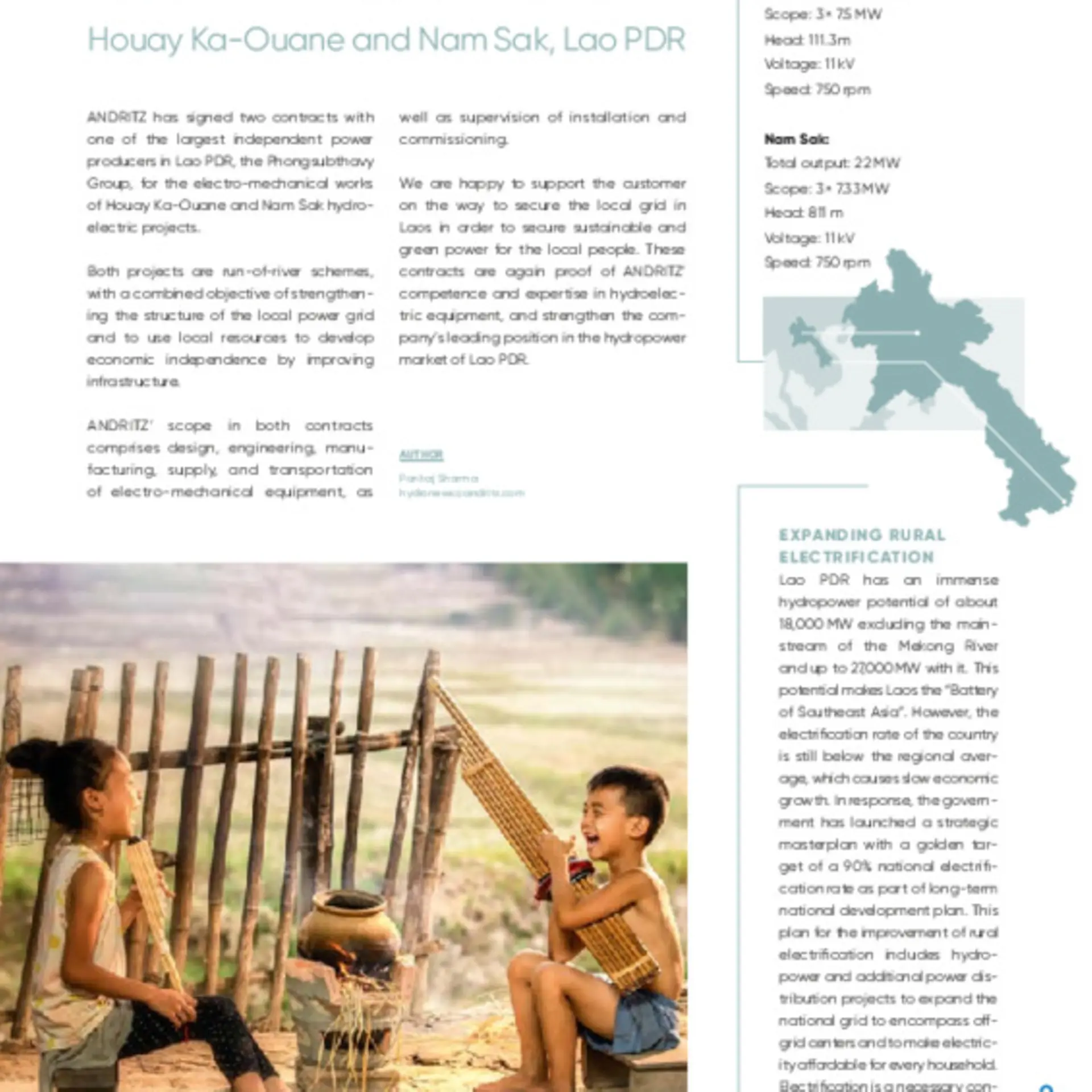 ANDRITZ has signed two contracts with one of the largest independent power producers in Lao PDR, the Phongsubthavy Group, for the electro-mechanical works of Houay Ka-Ouane and Nam Sak hydroelectric projects.