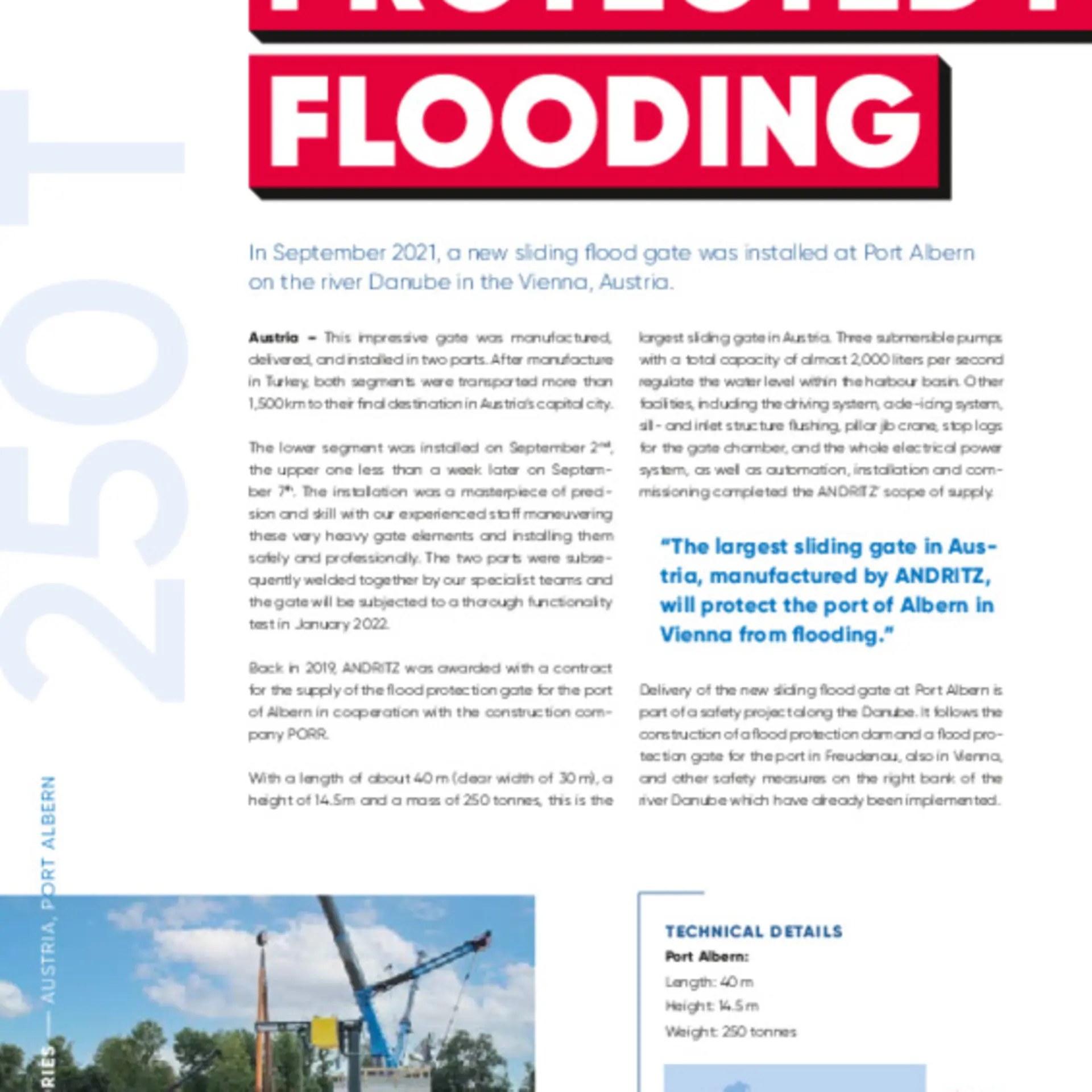 Delivery of the new sliding flood gate at Port Albern is part of a safety project along the Danube. It follows the construction of a flood protection dam and a flood protection gate for the port in Freudenau, also in Vienna, and other safety measures on the right bank of the river Danube which have already been implemented.