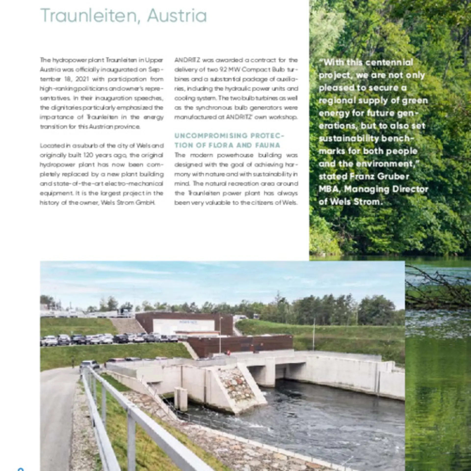 This pioneering hydropower plant was built within only 26 months. Using top-tier technology, the new plant layout achieves an 80% increase in power output with an estimated hydroelectric power production of 91 GWh annually. Traunleiten will thus provide sustainable and clean energy for over 60,000 local people today and for future generations too.