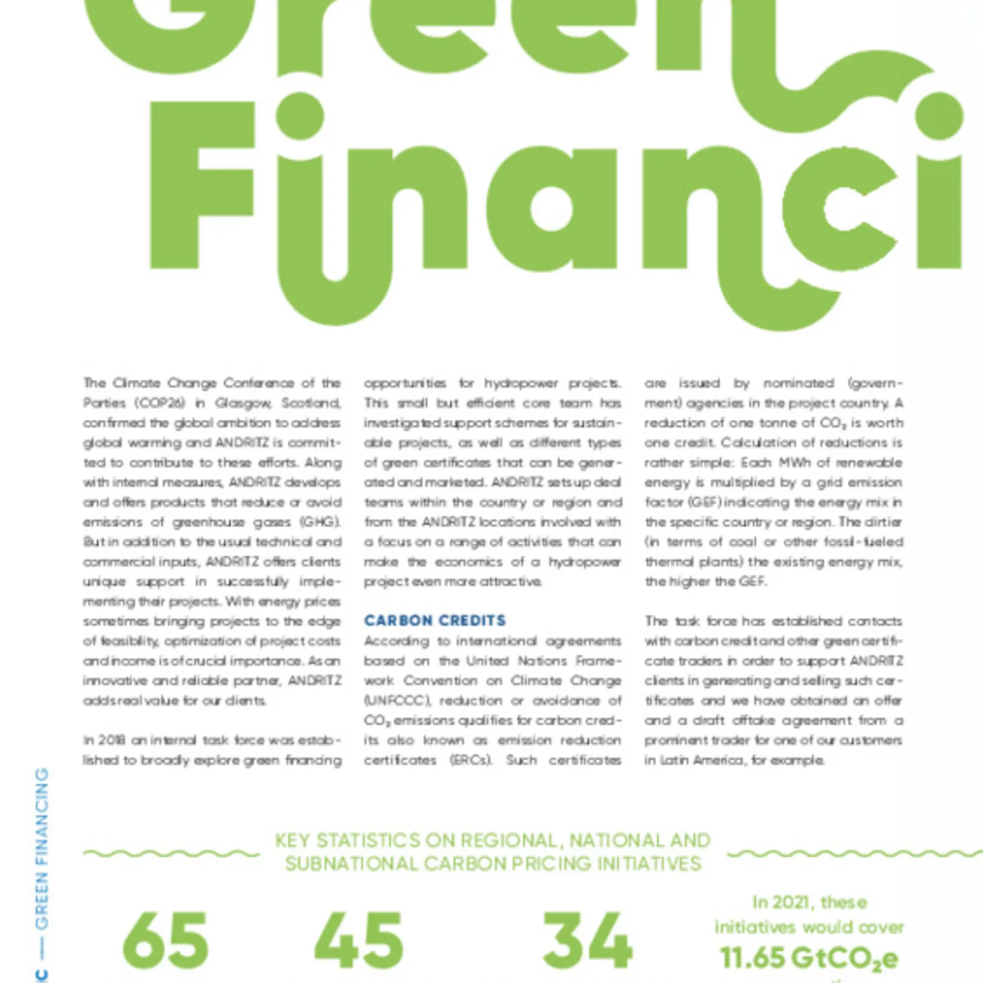 In 2018 an internal task force was established to broadly explore green financing opportunities for hydropower projects. This small but efficient core team has investigated support schemes for sustainable projects, as well as different types of green certificates that can be generated and marketed. ANDRITZ sets up deal teams within the country or region and from the ANDRITZ locations involved with a focus on a range of activities that can make the economics of a hydropower project even more attractive.