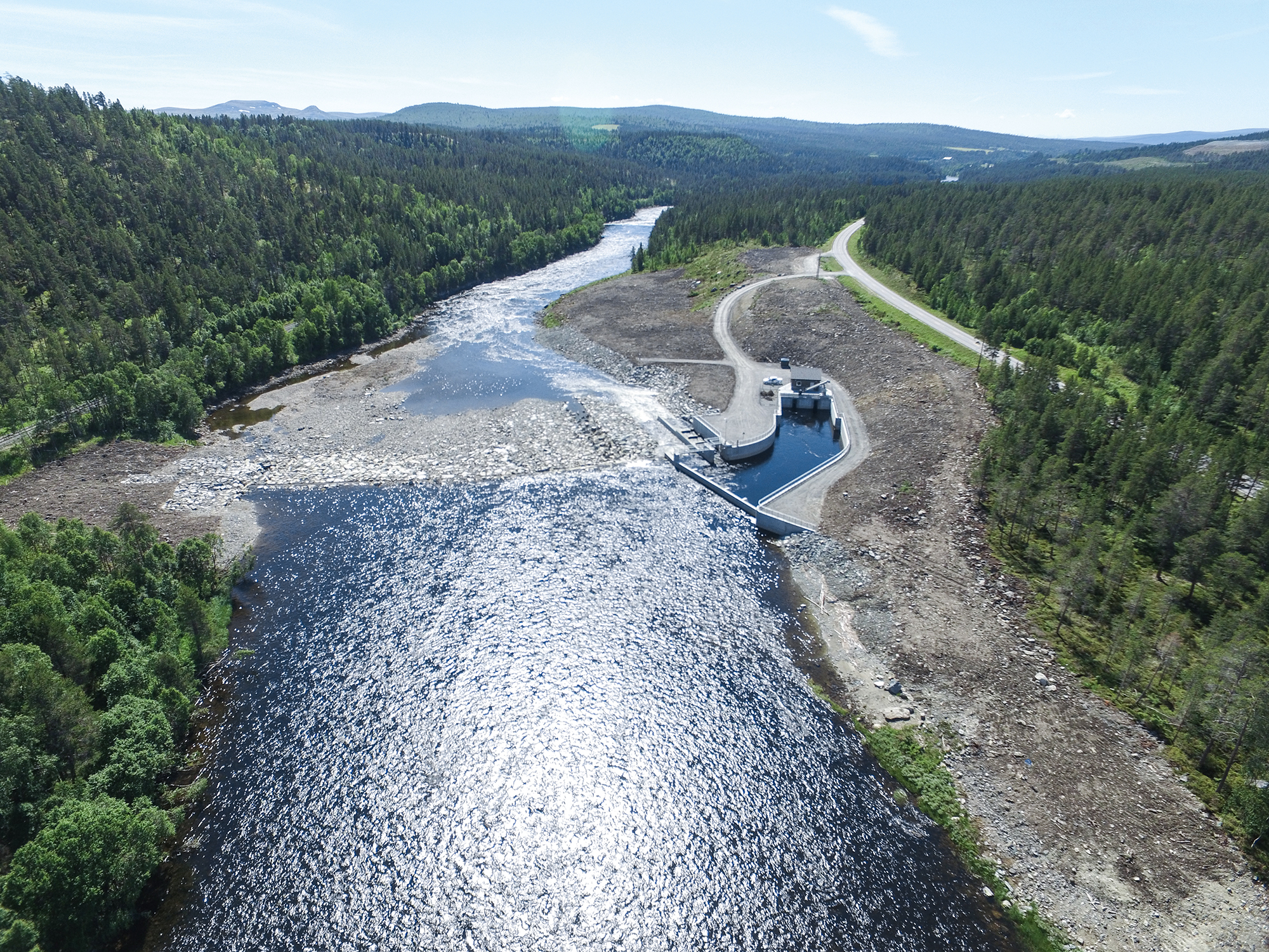 The Tolga power plant is unique as the intake structure is built in such a way that the fish are completely prevented from swimming into the turbine. Its intake trash rack has openings of only 15 mm width and is at a low angle to the water flow. Such intake racks have never been built in Norway before but make it possible for the fish to be led safely past the intake to a bypass passage. This arrangement allows migrating fish to pass the structure completely unharmed.