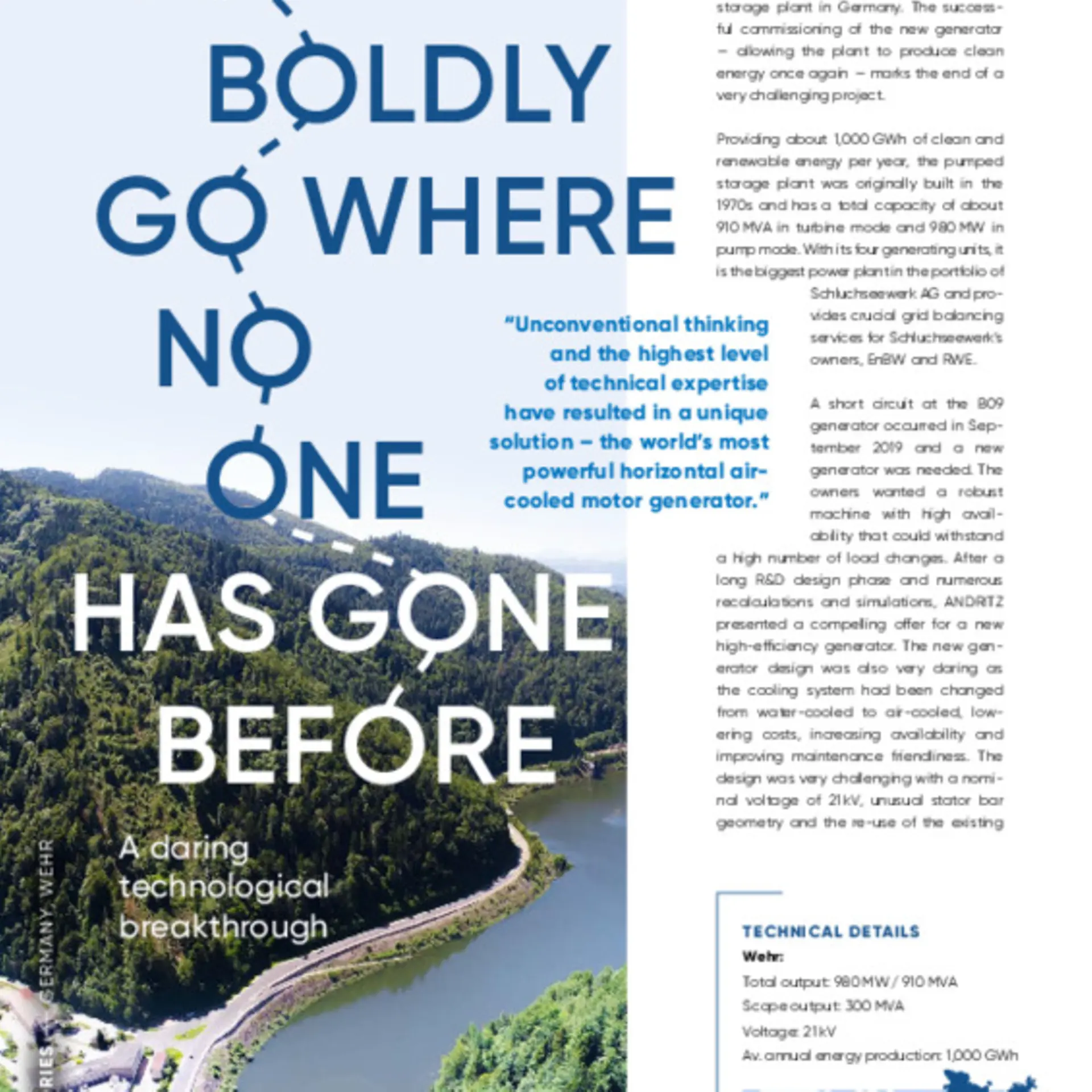 Since the end of 2021, the world’s most powerful horizontal air-cooled motor generator has been in commercial operation at the Wehr pumped storage plant in Germany. The successful commissioning of the new generator — allowing the plant to produce clean energy once again — marks the end of a very challenging project.