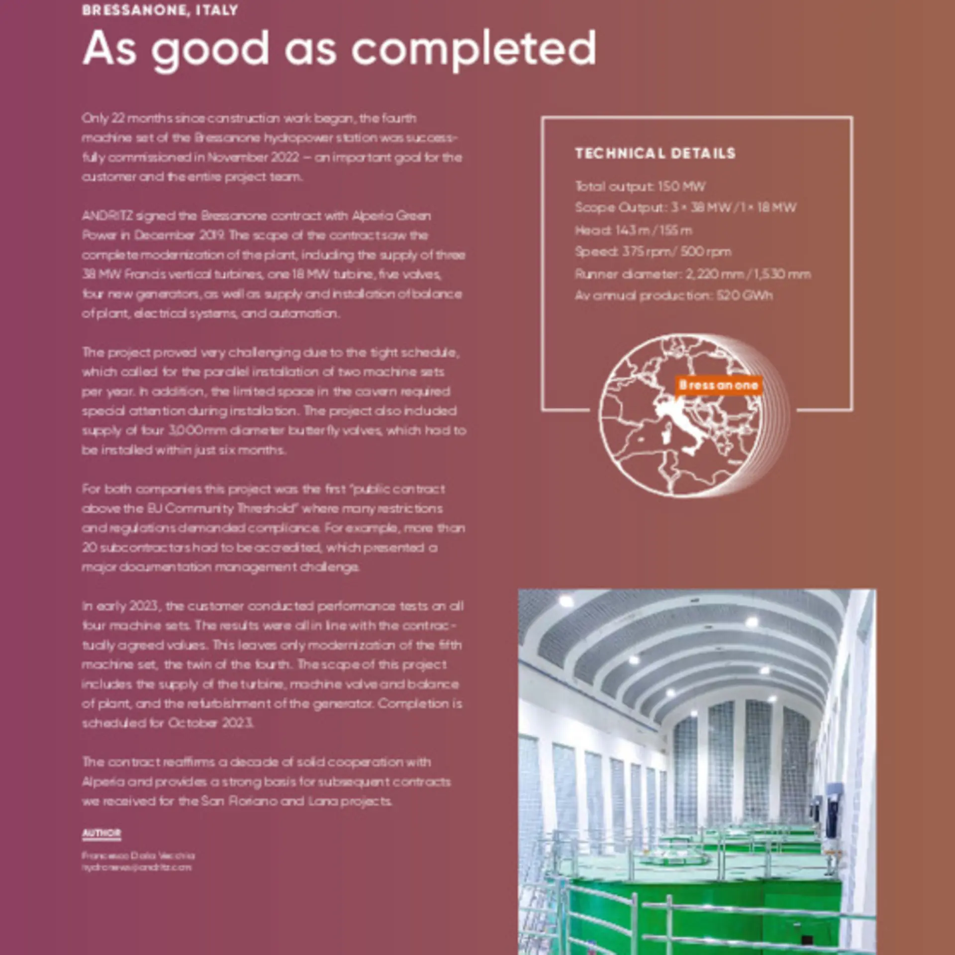 ANDRITZ signed the Bressanone contract with Alperia Green Power in December 2019. The scope of the contract saw the complete modernization of the plant, including the supply of three 38 MW Francis vertical turbines, one 18 MW turbine, five valves, four new generators, as well as supply and installation of balance of plant, electrical systems, and automation.