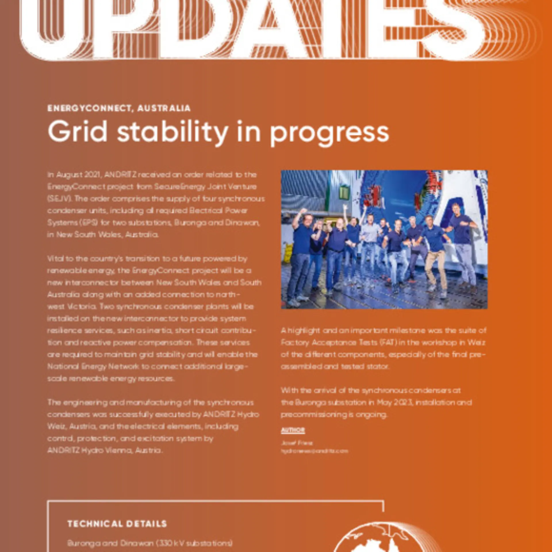 In August 2021, ANDRITZ received an order related to the EnergyConnect project from SecureEnergy Joint Venture (SEJV). The order comprises the supply of four synchronous condenser units, including all required Electrical Power Systems (EPS) for two substations, Buronga and Dinawan, in New South Wales, Australia.