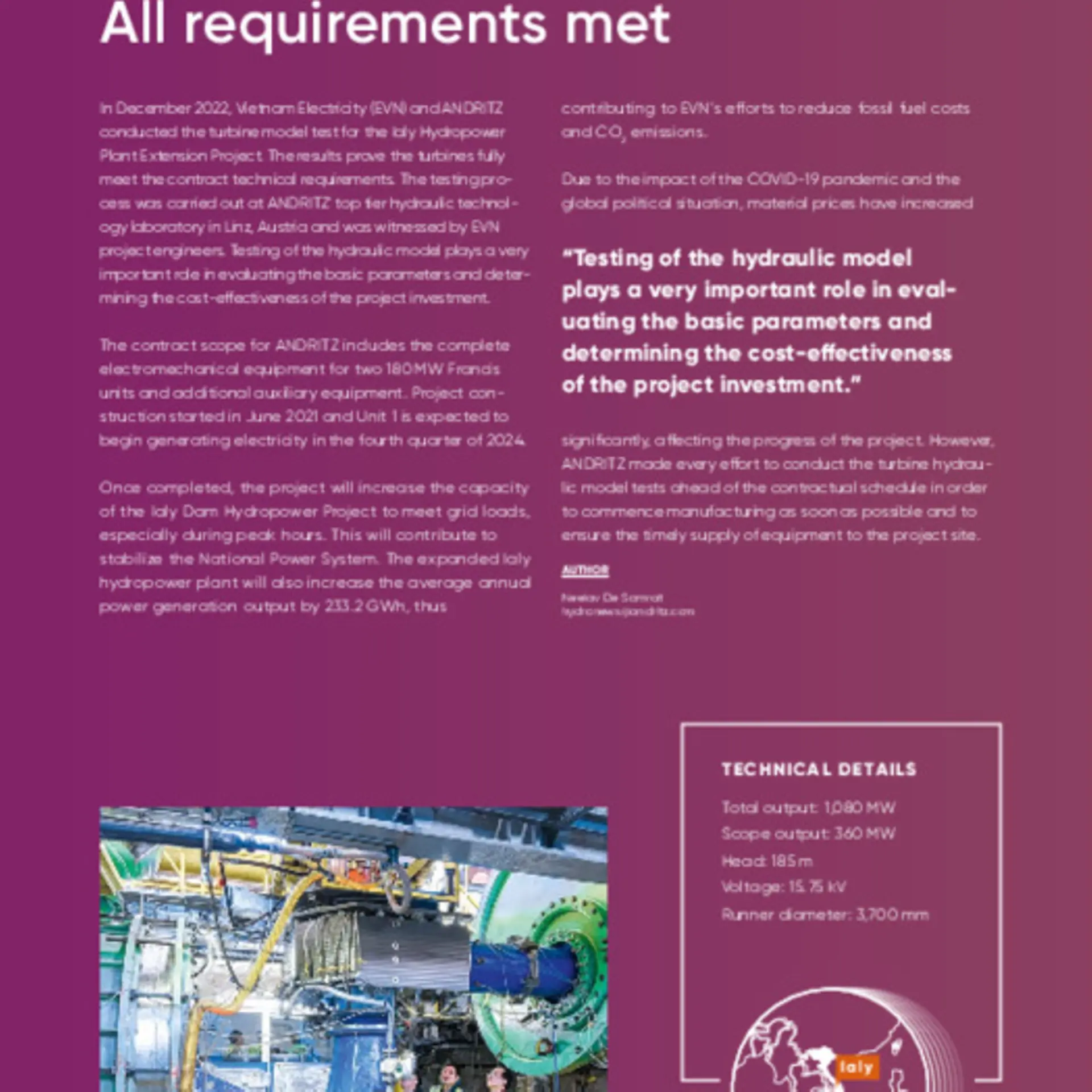 In December 2022, Vietnam Electricity (EVN) and ANDRITZ conducted the turbine model test for the Ialy Hydropower Plant Extension Project. The results prove the turbines fully meet the contract technical requirements. The testing process was carried out at ANDRITZ' top tier hydraulic technology laboratory in Linz, Austria and was witnessed by EVN project engineers. Testing of the hydraulic model plays a very important role in evaluating the basic parameters and determining the cost-effectiveness of the project investment.