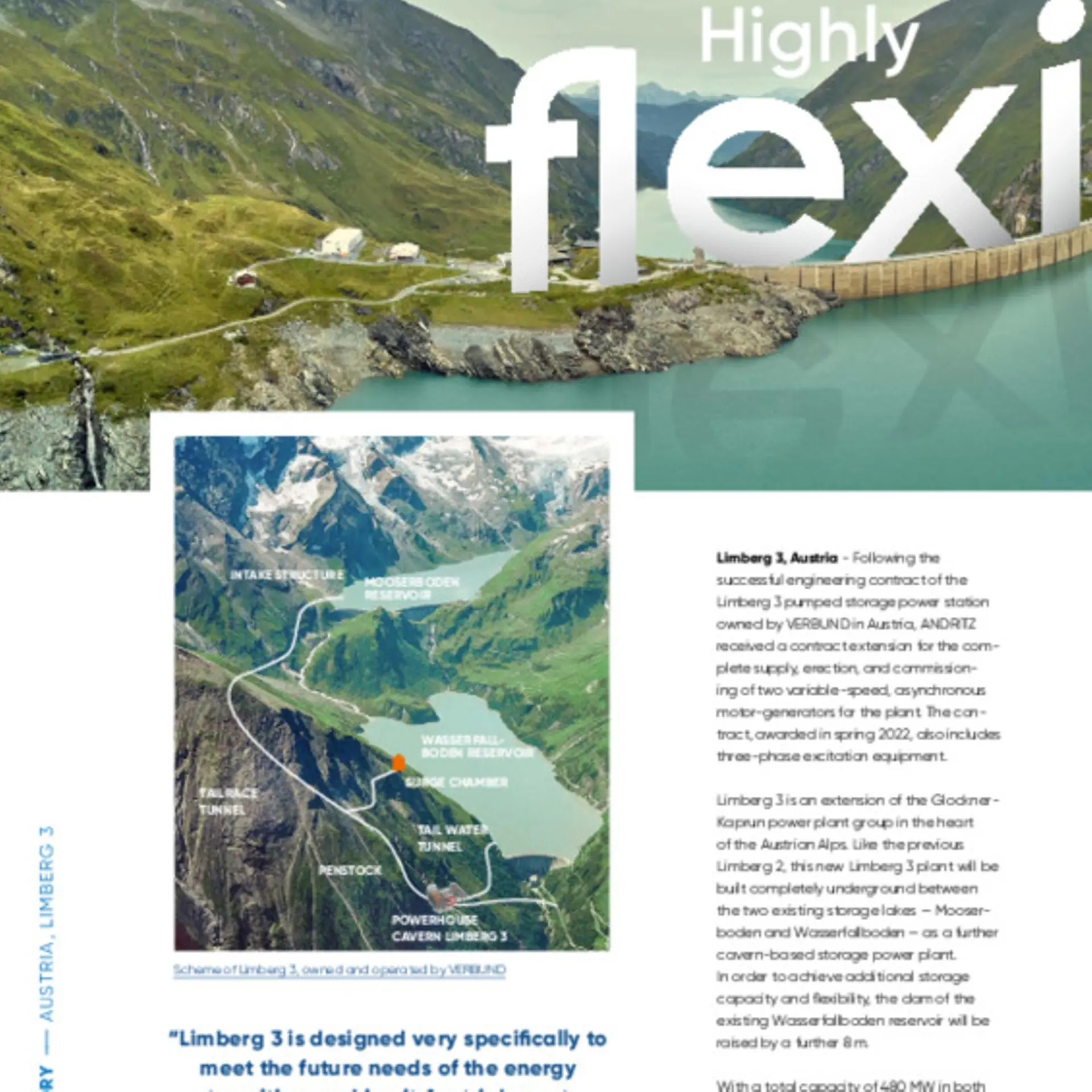 Following the successful engineering contract of the Limberg 3 pumped storage power station owned by VERBUND in Austria, ANDRITZ received a contract extension for the complete supply, erection, and commissioning of two variable-speed, asynchronous motor-generators for the plant.