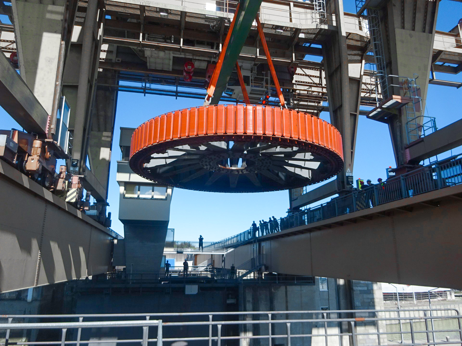 Lowering of generator rotor at the Wallsee-MItterkirchen power plant. ANDRITZ is not only the OEM for, but is also involved in the comprehensive refurbishment of the electromechanical equipment.
