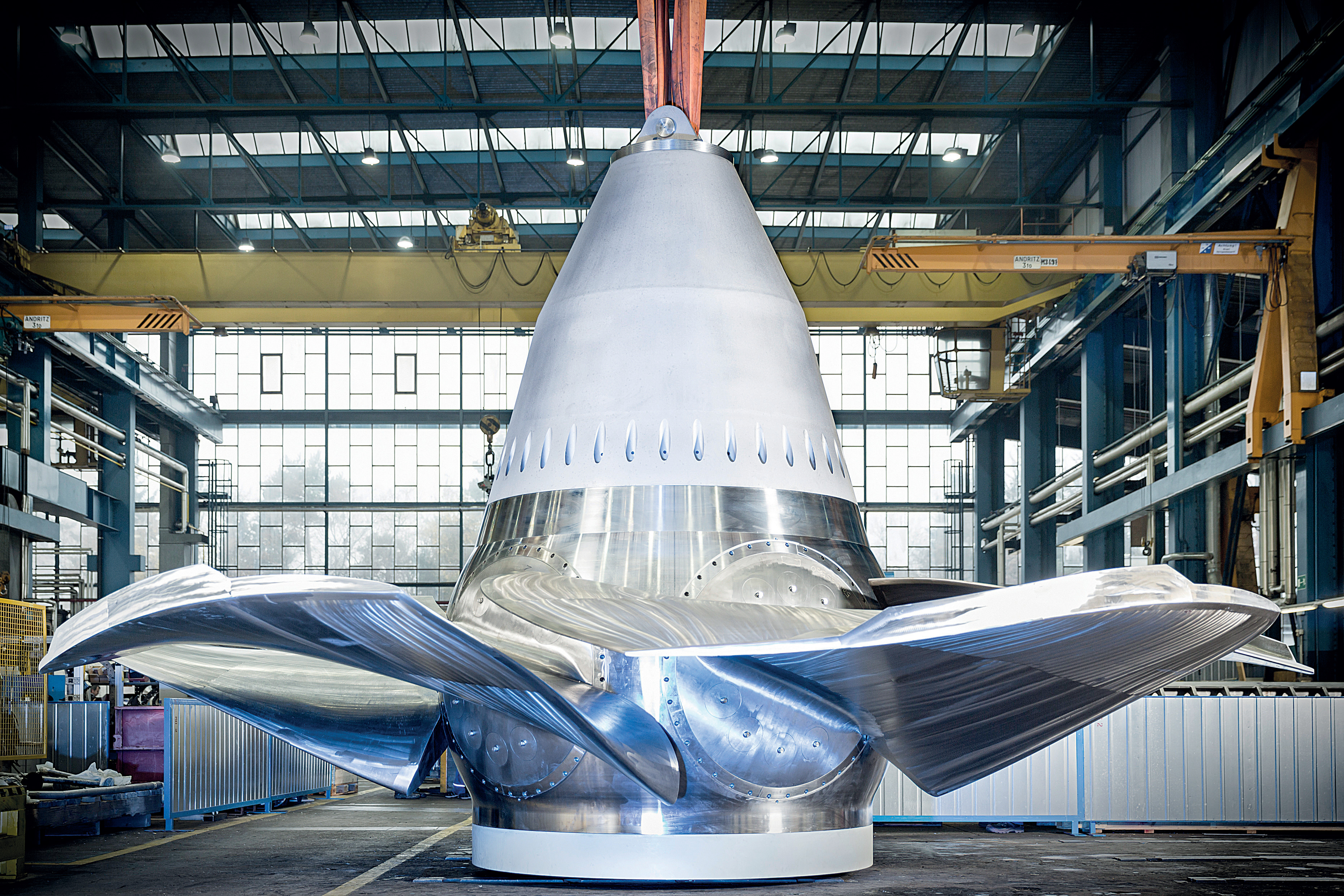 One of the new Kaplan turbine runners for the Ybbs-Persenbeug power plant, a run-of-river power plant on the Austrian Danube, which was renovated as part of the Ybbs 2020 rehabilitation project.