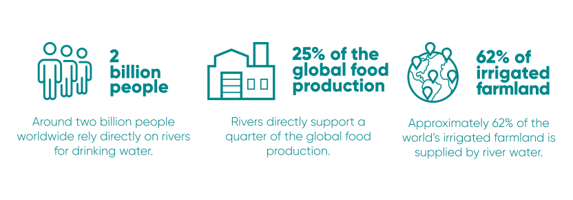 Yet the most valuable resource that rivers offer humankind is water itself. Around two billion people worldwide rely directly on rivers for drinking water, and approximately 62% of the world’s irrigated farmland is supplied by river water. Rivers thus directly support a quarter of the global food production. (Source: WWF)