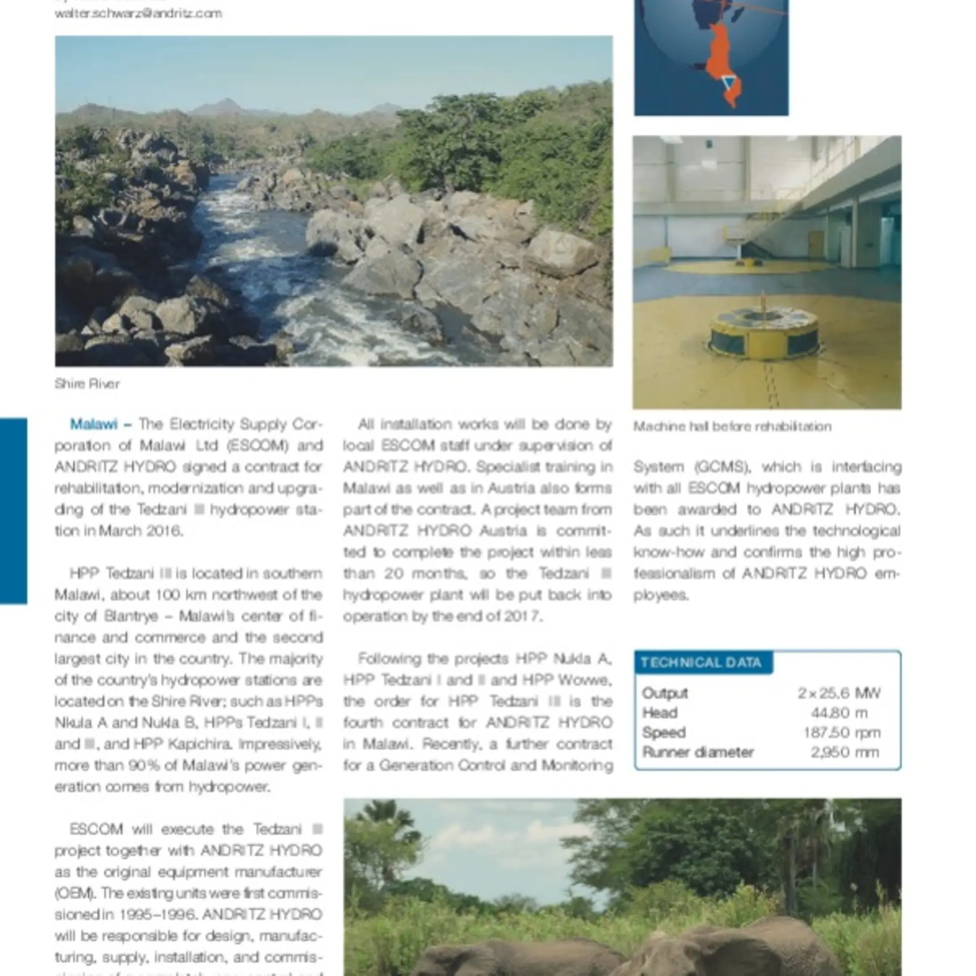 In March 2016, the Electricity Supply Corporation of Malawi Ltd (ESCOM) and ANDRITZ HYDRO signed a contract for rehabilitation, modernization and upgrading of the Tedzani III hydropower station.