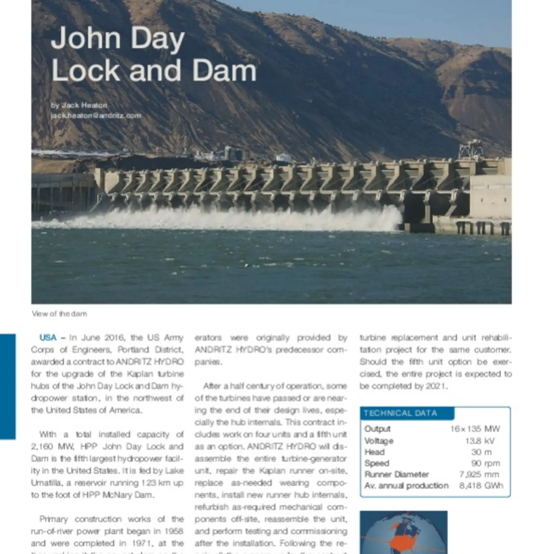 In June 2016, the US Army Corps of Engineers, Portland District, awarded a contract to ANDRITZ HYDRO for the upgrade of the Kaplan turbine hubs of the John Day Lock and Dam hydropower station, in the northwest of the United States of America.