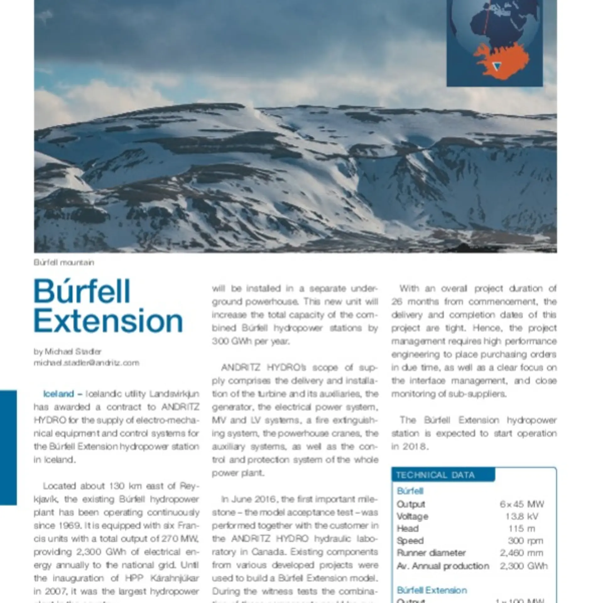 Icelandic utility Landsvirkjun has awarded a contract to ANDRITZ HYDRO for the supply of electro-mechanical equipment and control systems for the Búrfell Extension hydropower station in Iceland.