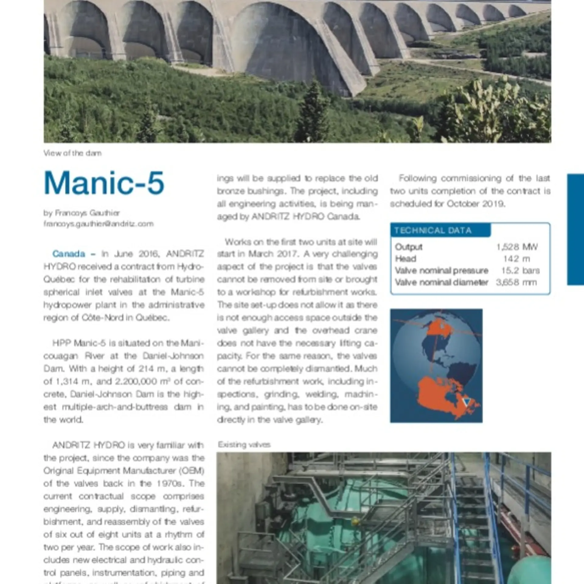 In June 2016, ANDRITZ HYDRO received a contract from Hydro-Québec for the rehabilitation of turbine spherical inlet valves at the Manic-5 hydropower plant in the administrative region of Côte-Nord in Québec.