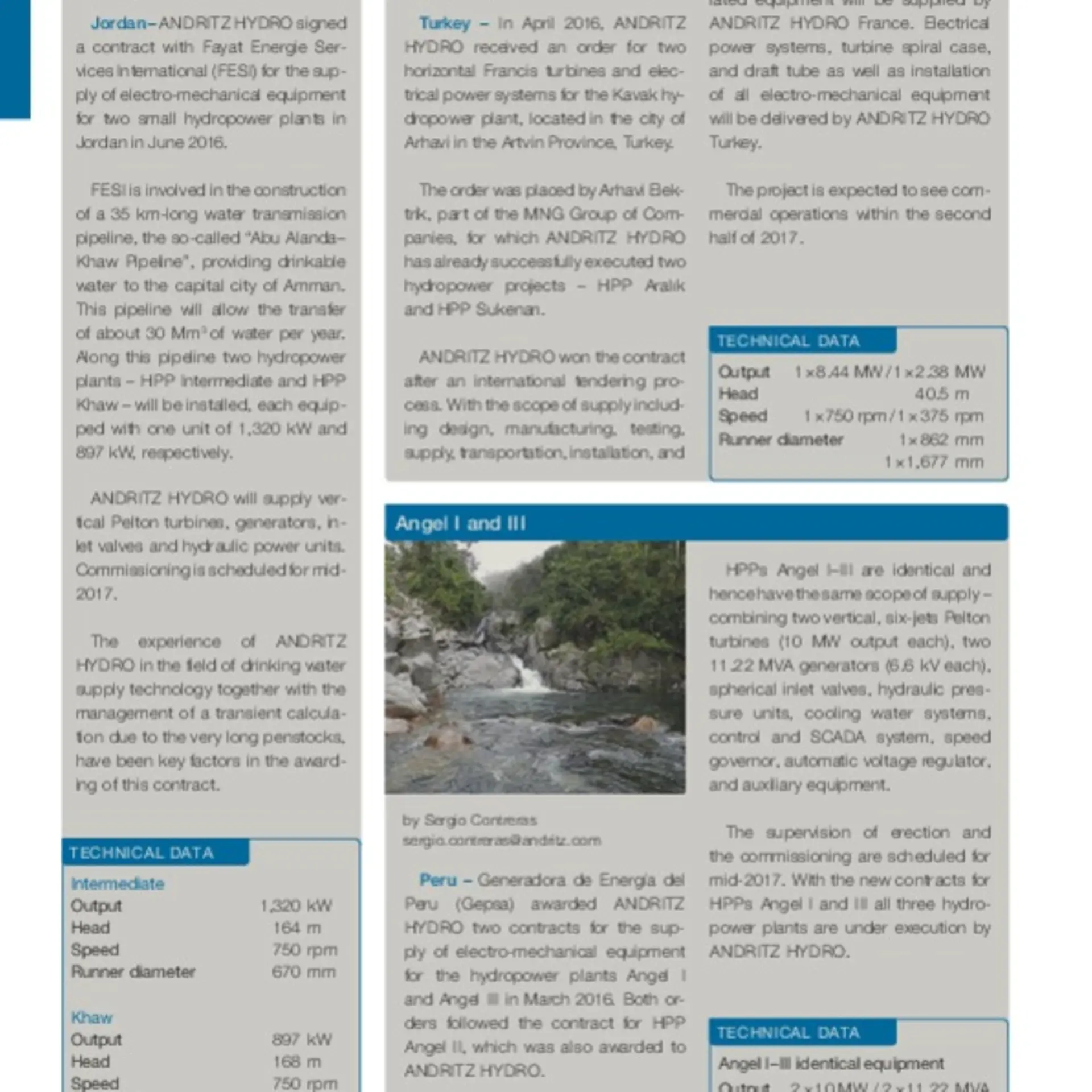 The supervision of erection and the commissioning are scheduled for mid-2017. With the new contracts for HPPs Angel I and III all three hydropower plants are under execution by ANDRITZ HYDRO.